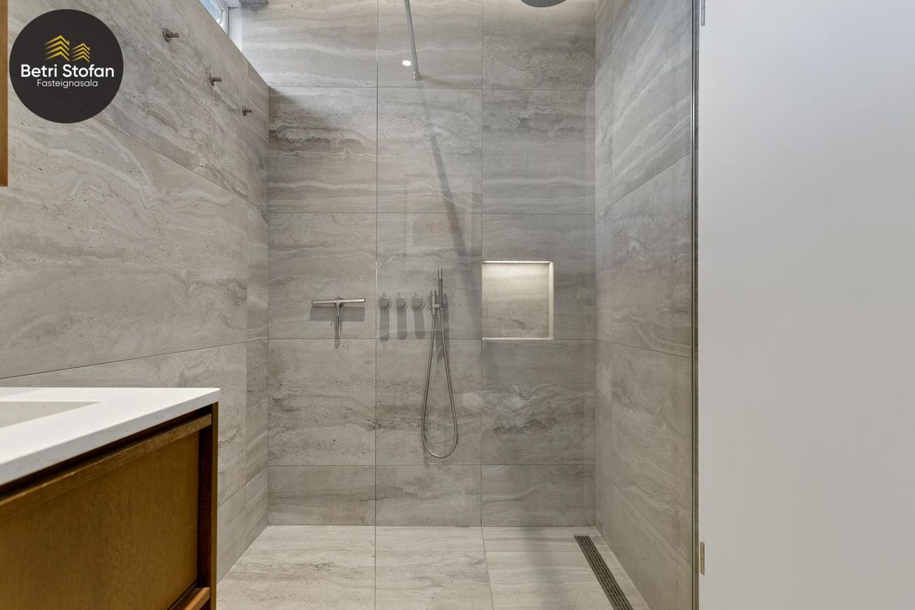 Baðherbergi II: Flísalagt í hólf og gólf, rúmgóð sturta, VOLA blöndunartæki, vaskur og borðplata úr kvartz, innrétting með neðri skápum og efri speglaskáp með innfelldri lýsingu.