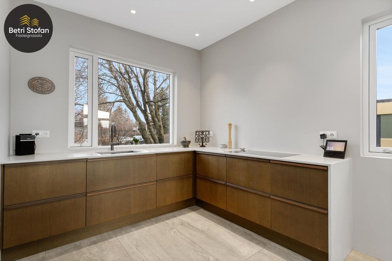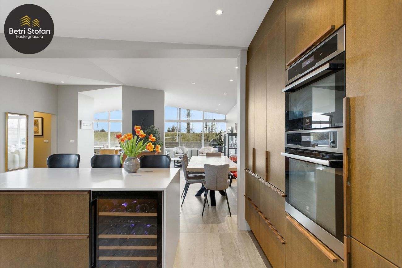 Eldhús: Nýleg innrétting frá HTH með steini frá S.Helgasyni, kvartz. Vönduð tæki, tveir ofnum, annar með innbyggðri örbylgju, helluborð með fimm hellum. Gólfhiti.