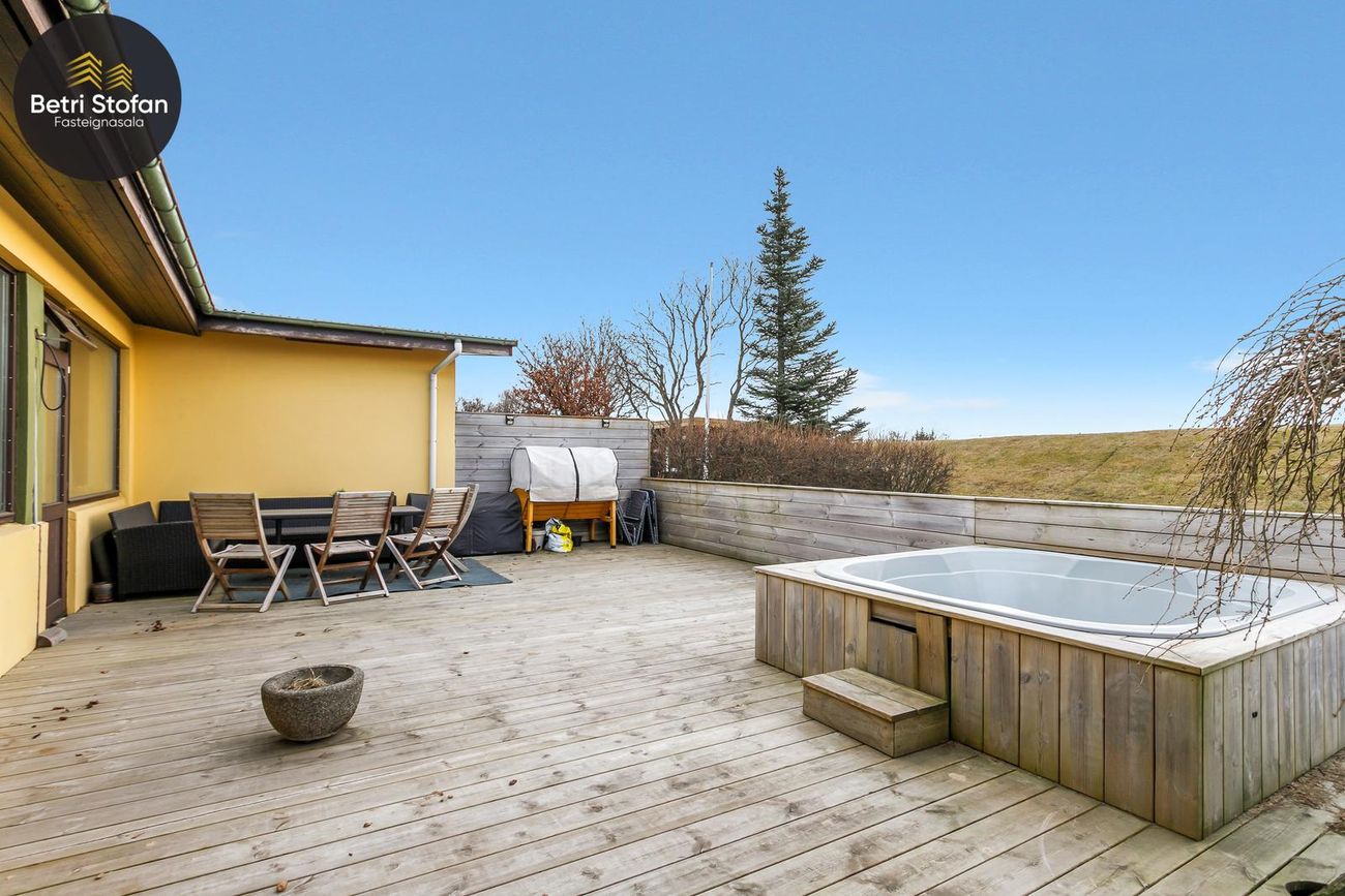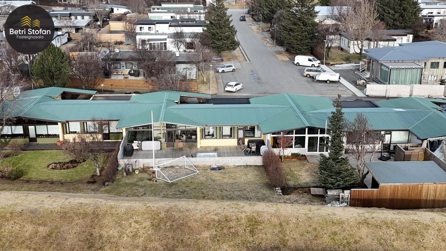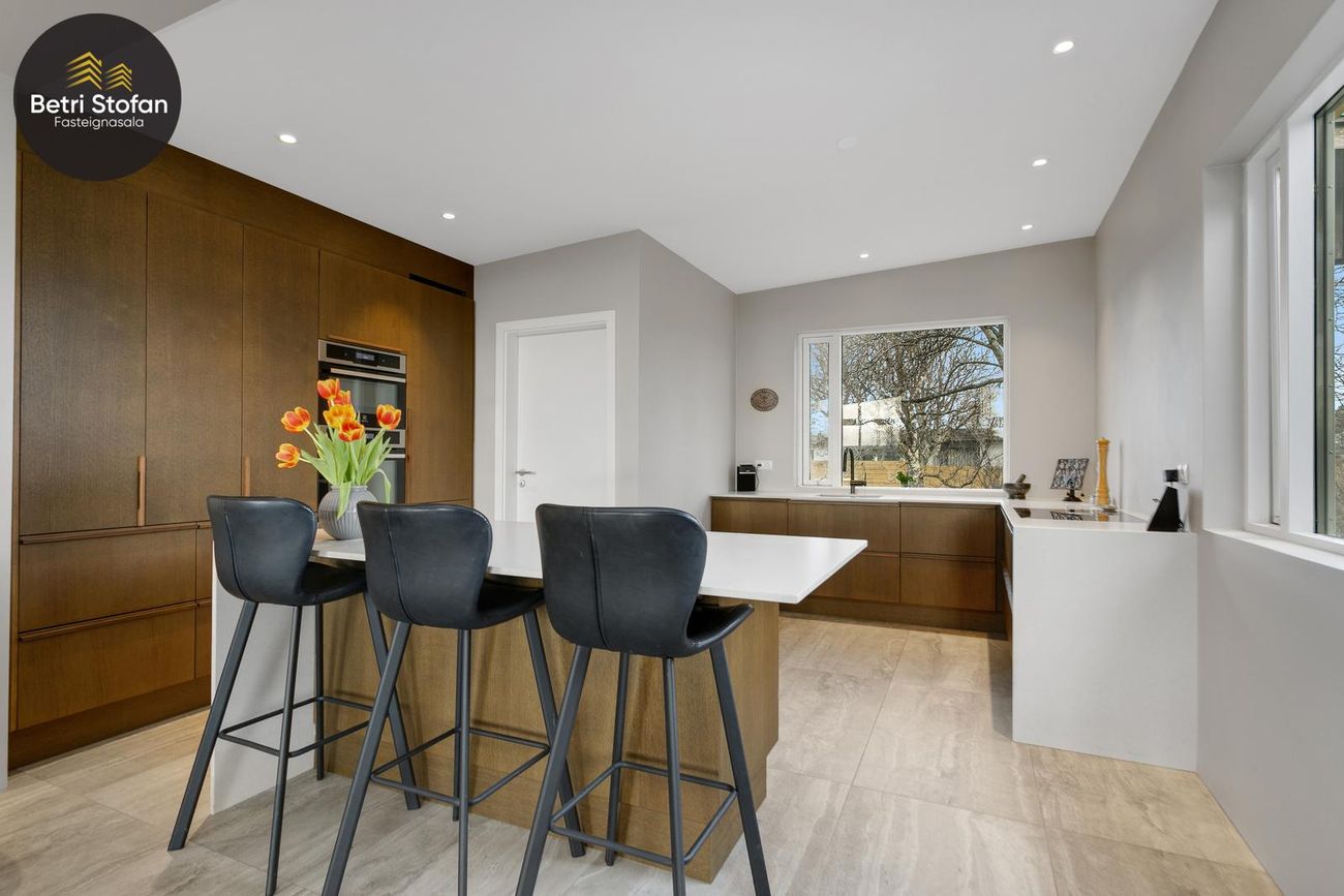 Eignin er samtals um 180 fm og skiptist í rúmgóða og bjarta stofu með góðri lofthæð, flísalagt með gólfhita og útgengi út í góðan garð til suðurs með heitum potti. 3 svefnherbergi, 2 baðherbergi, opið eldhús, þvottahús, geymslur og tvöfaldan bílskúr.