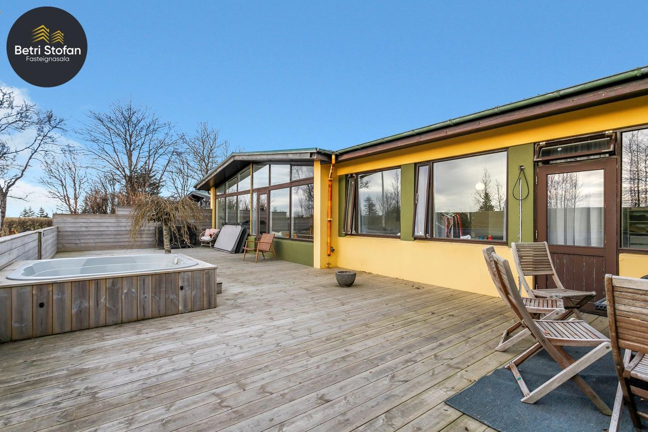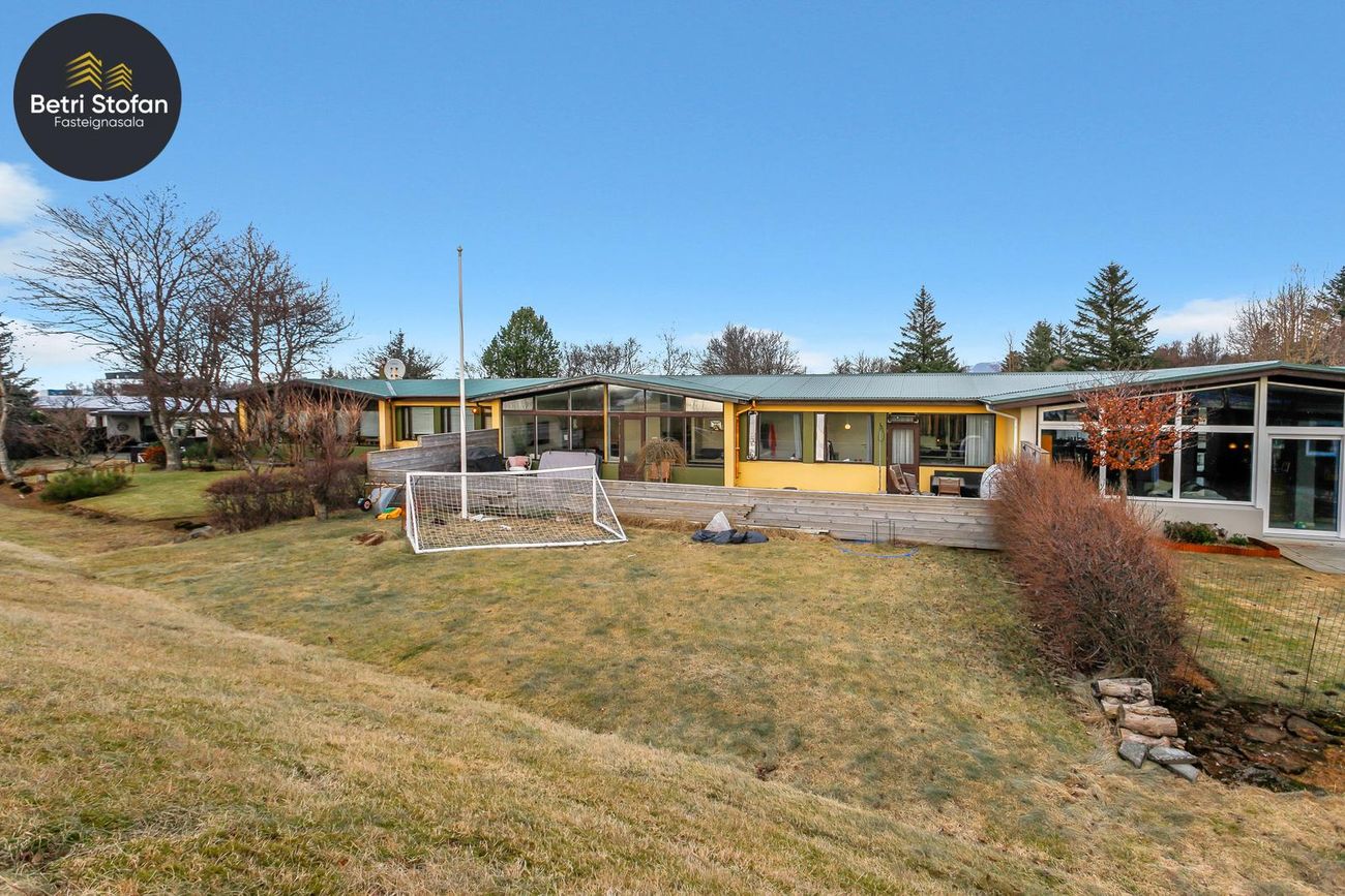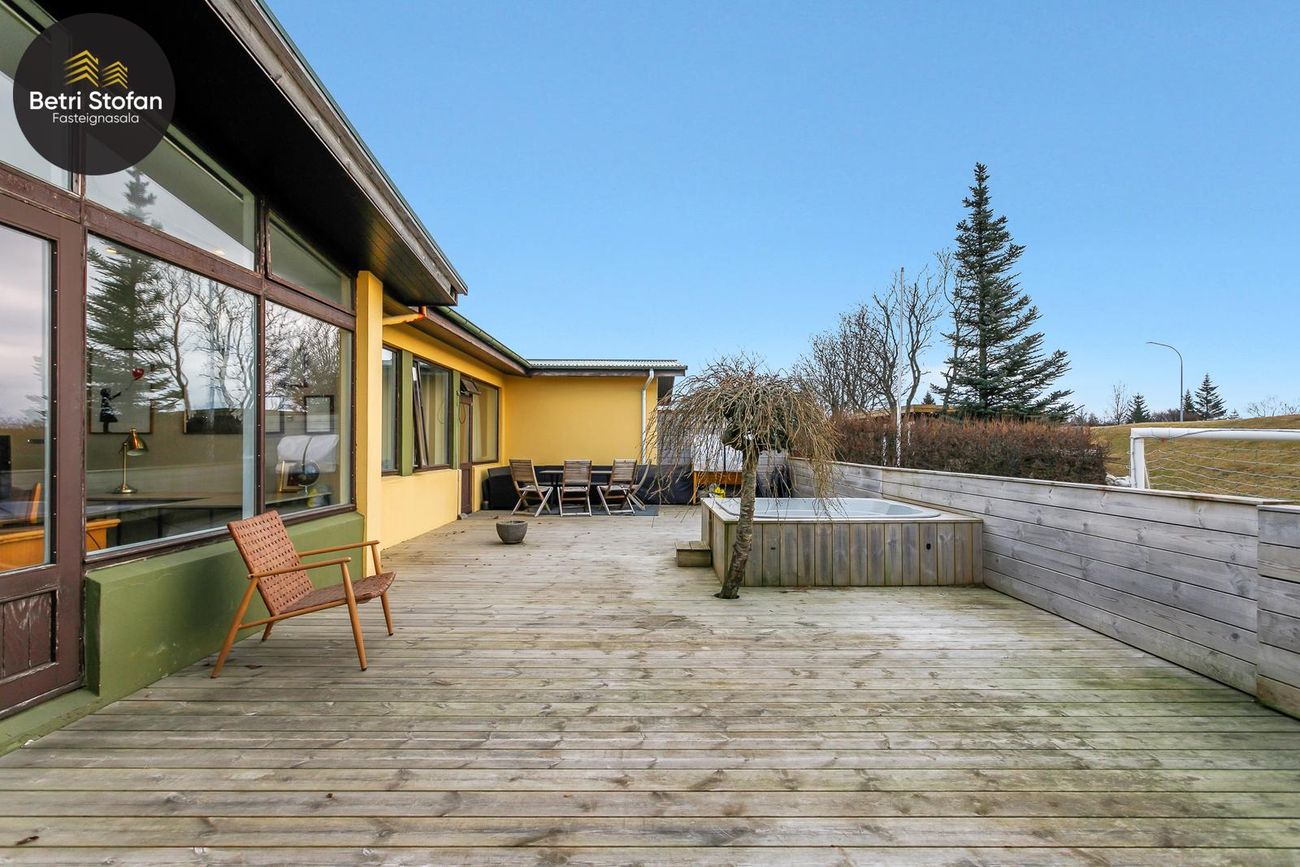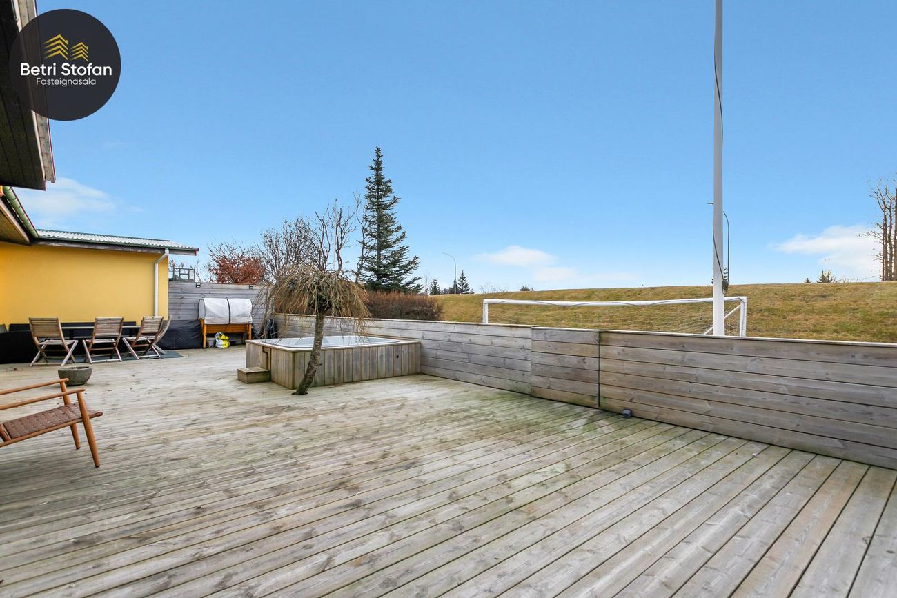 Eignin er samtals um 180 fm og skiptist í rúmgóða og bjarta stofu með góðri lofthæð, flísalagt með gólfhita og útgengi út í góðan garð til suðurs með heitum potti. 3 svefnherbergi, 2 baðherbergi, opið eldhús, þvottahús, geymslur og tvöfaldan bílskúr.