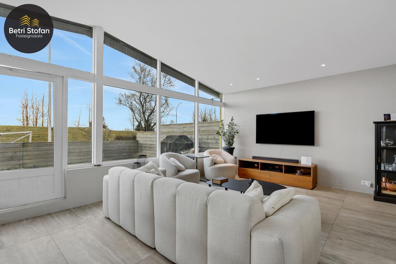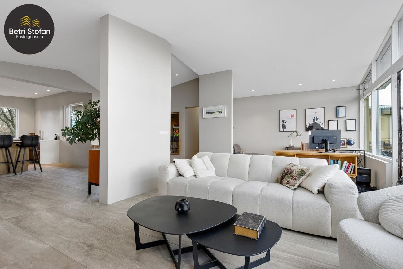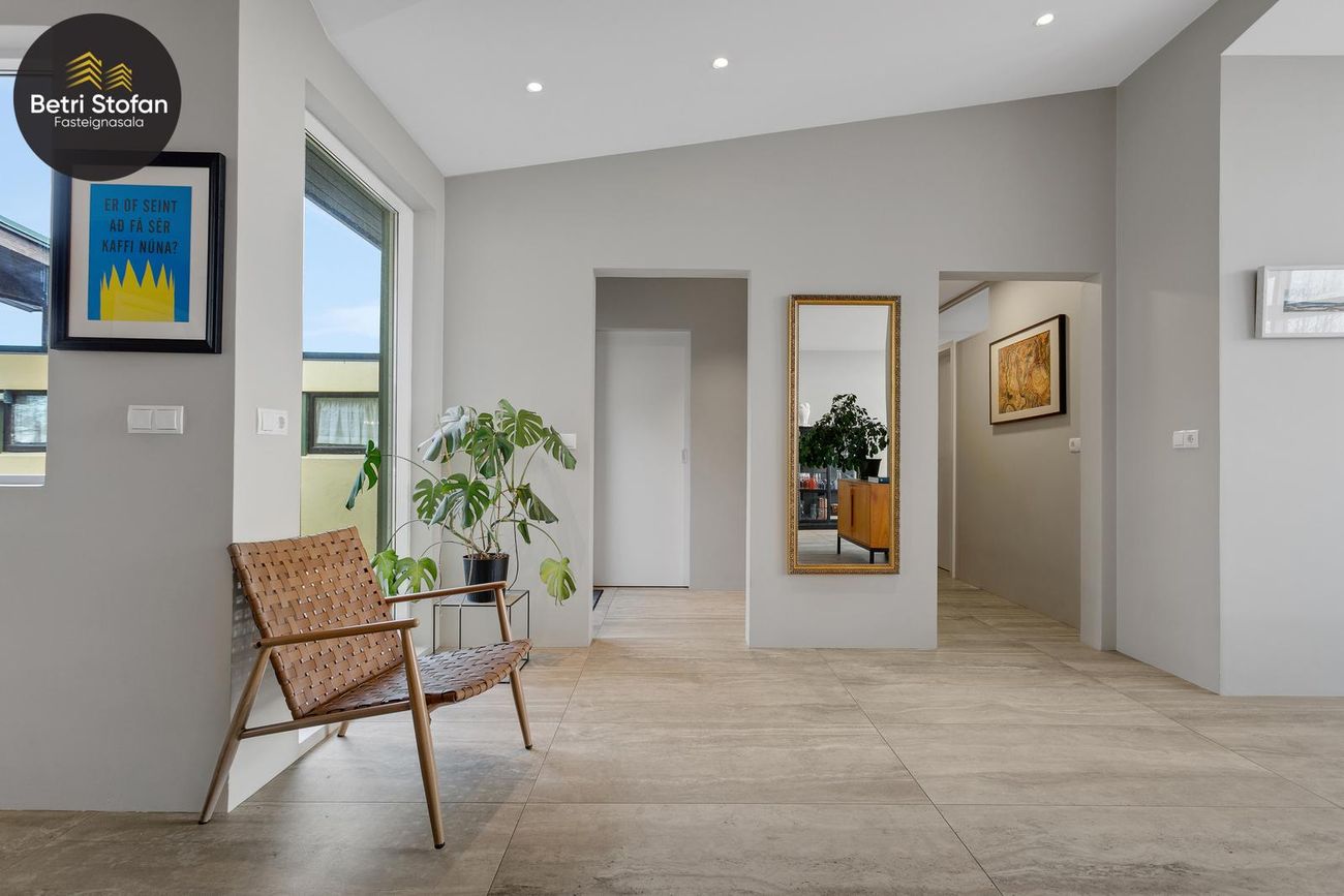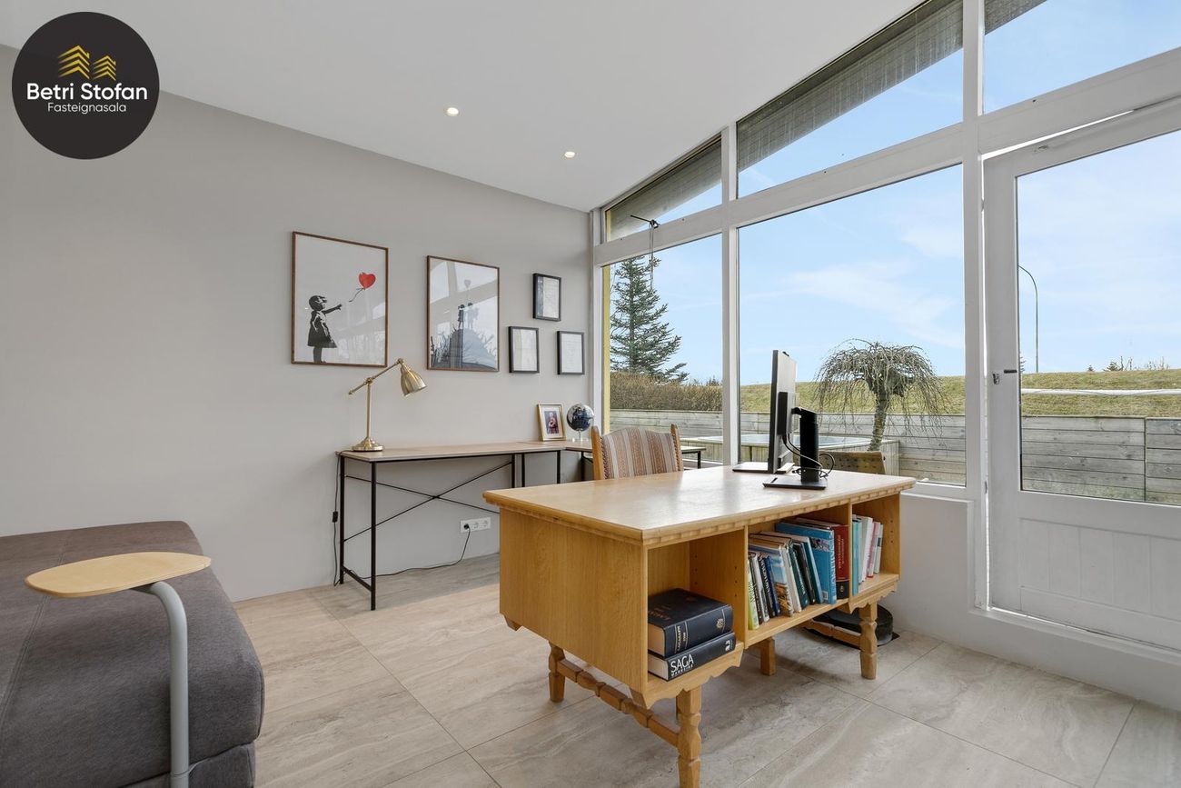 Stofa: Stór og björt með stórum gluggum og hátt til lofts, flísar á gólfi. Útgengi út á suðurpall. Gólfhiti