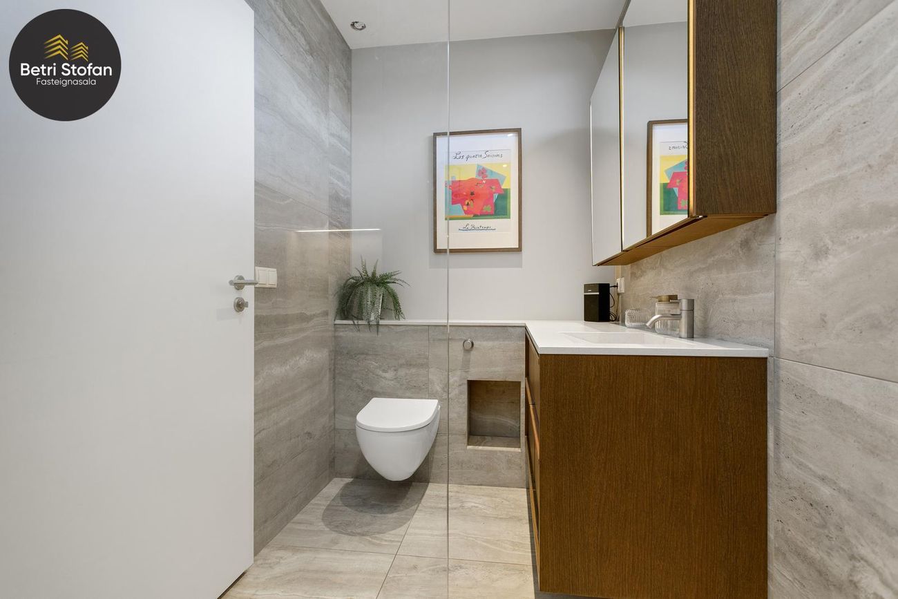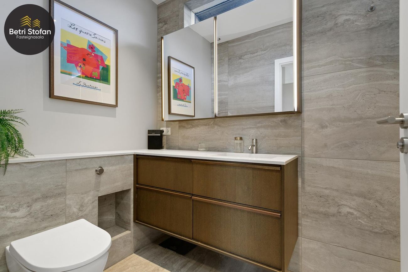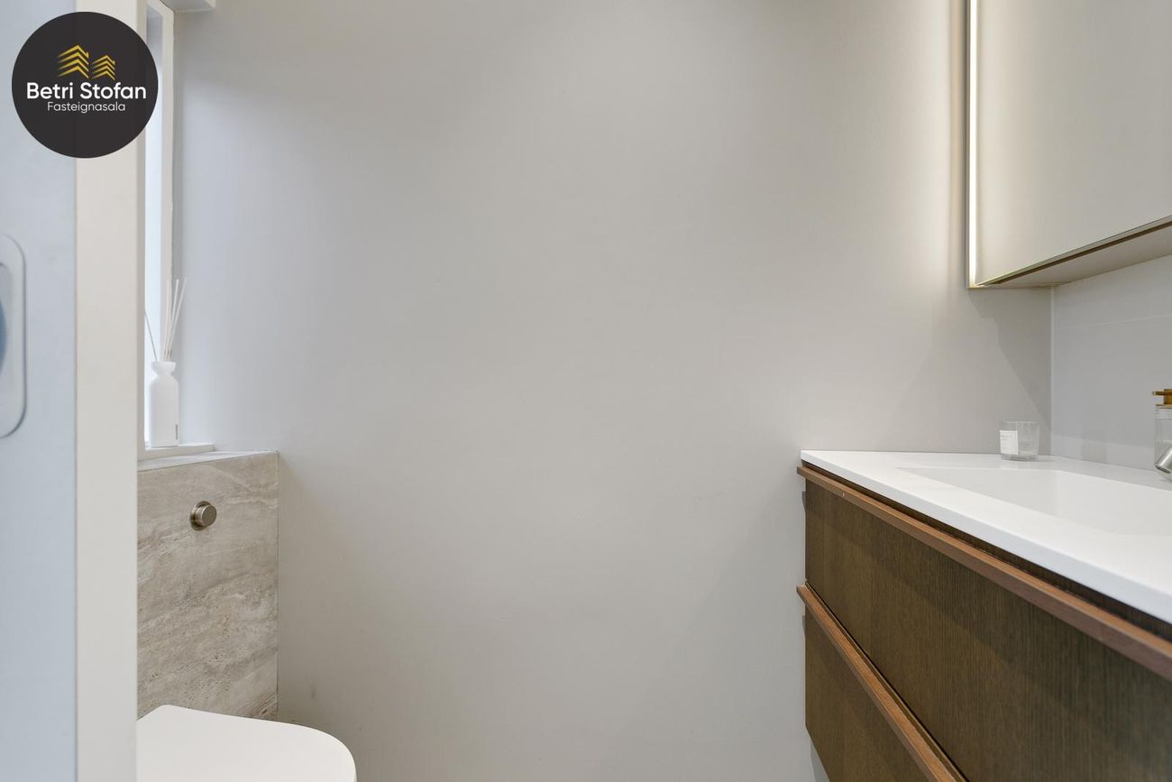 Baðherbergi II: Flísalagt í hólf og gólf, rúmgóð sturta, VOLA blöndunartæki, vaskur og borðplata úr kvartz, innrétting með neðri skápum og efri speglaskáp með innfelldri lýsingu.