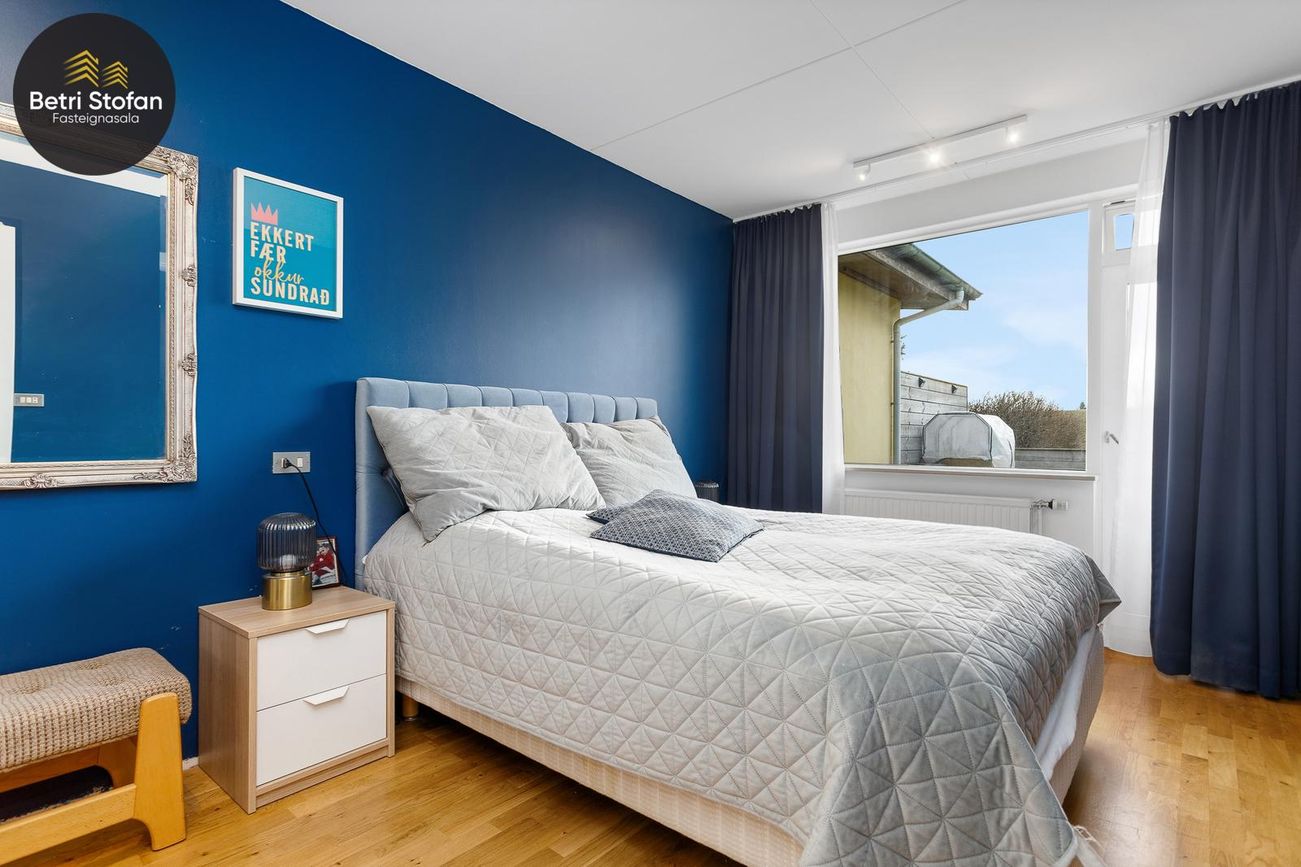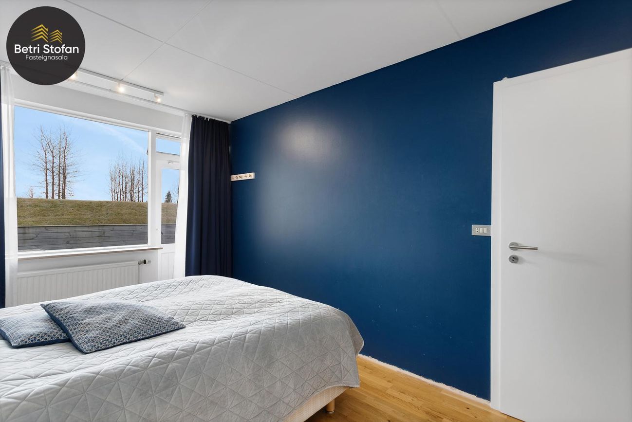 Hjónaherbergi: Parket á gólfi, gott skápapláss, útgengt út í garð. Nýtt hurðastykki er til og fylgir með.