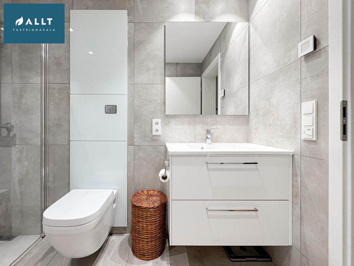 Flísalagt baðherbergi með stórri sturtu, upphengt salerni og tengi fyrir þvottavél og þurrkara.