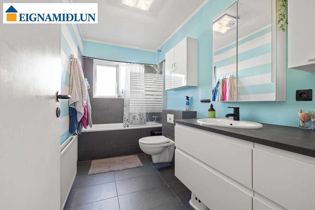 Parquet gólf í stofu, flísaleg gólf í baðherbergi og þvottahúsi.