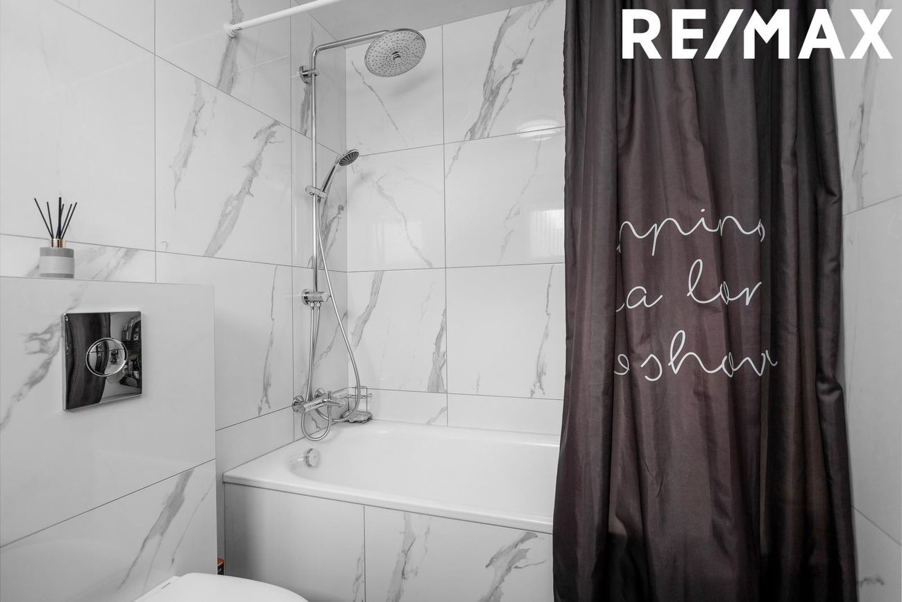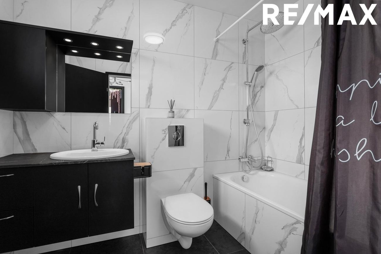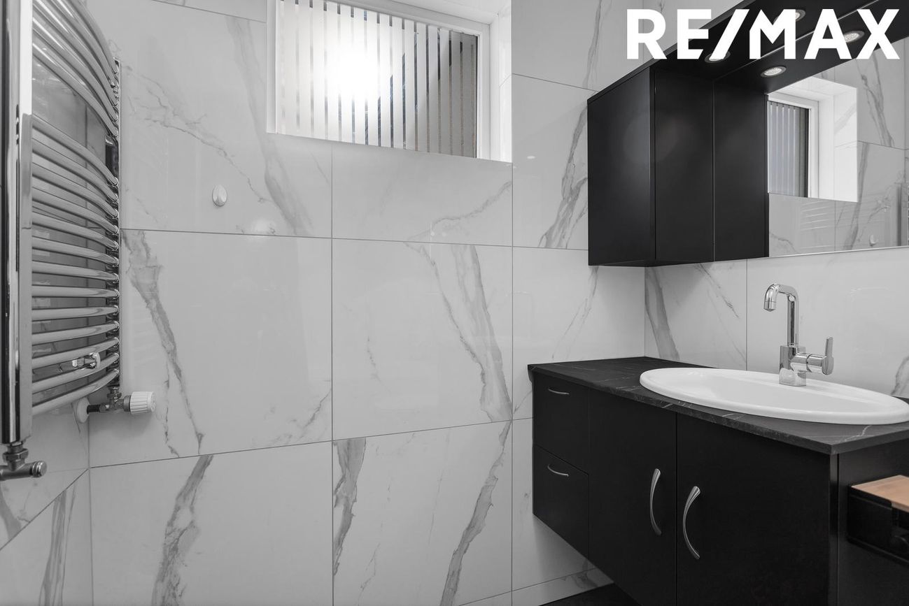 Baðherbergi: Glæsilega endurnýjað baðherbergi, flísalagt í hólf og gólf með dökkum gólfflísum og hvítum marmaramynstri á veggjum. Svart innrétting með handlaug, upphengt salerni, baðkar með sturtuaðstöðu og handklæðaofn.