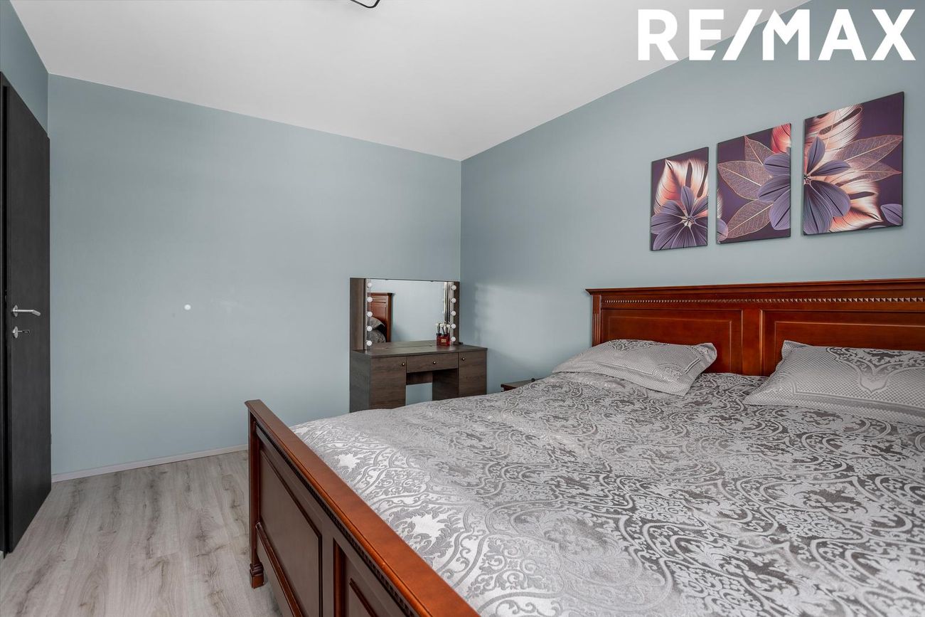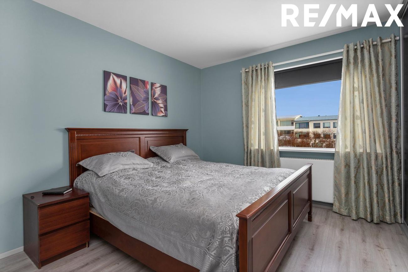 Hjónaherbergi: Rúmgott herbergi með nýlegu harðparketi á gólfi. Fataskápar, rennihurðir með spegli eru í herberginu. Bjart og notalegt.