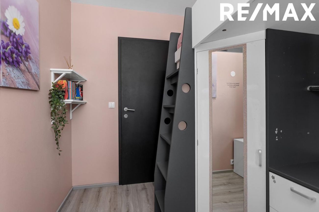 Svefnherbergi III: Herbergi með nýlegu harðparketi á gólfi. Hárúm, skrifborð og skápar eru samþætt í rýminu sem nýtist vel.