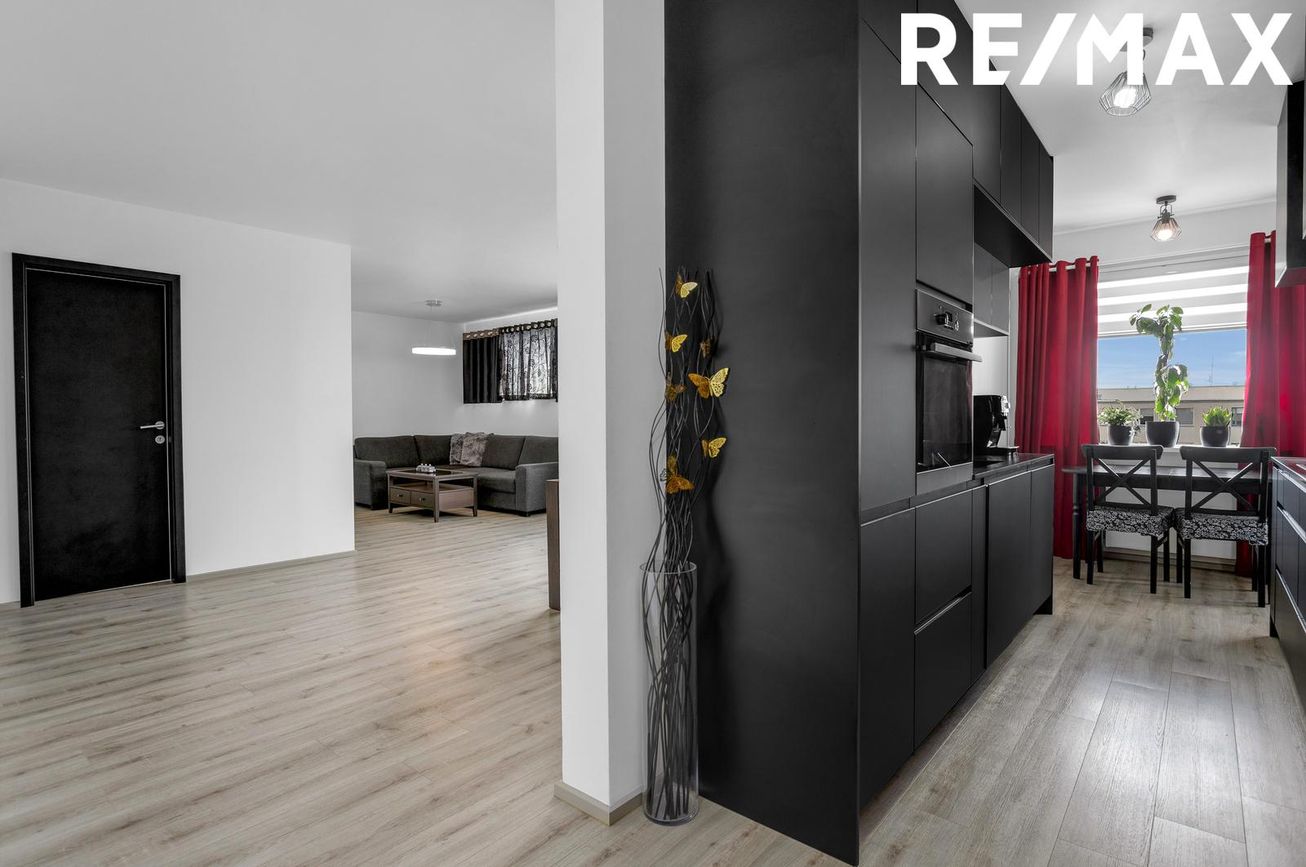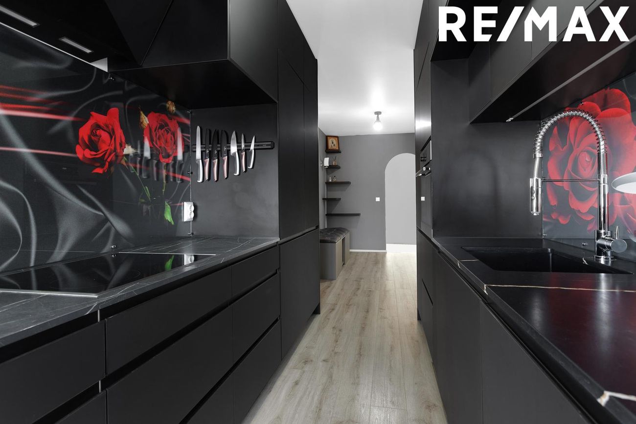 Eldhús: Endurnýjað eldhús með svörtum innréttingum og svörtum borðplötum. Á milli efri og neðri skápa er baklýst glerplata með rósamynstri sem setur skemmtilegan svip á rýmið. Innbyggður ofn, ísskápur og uppþvottavél ásamt helluborði, viftu og vask. Gluggar veita góða birtu inn.