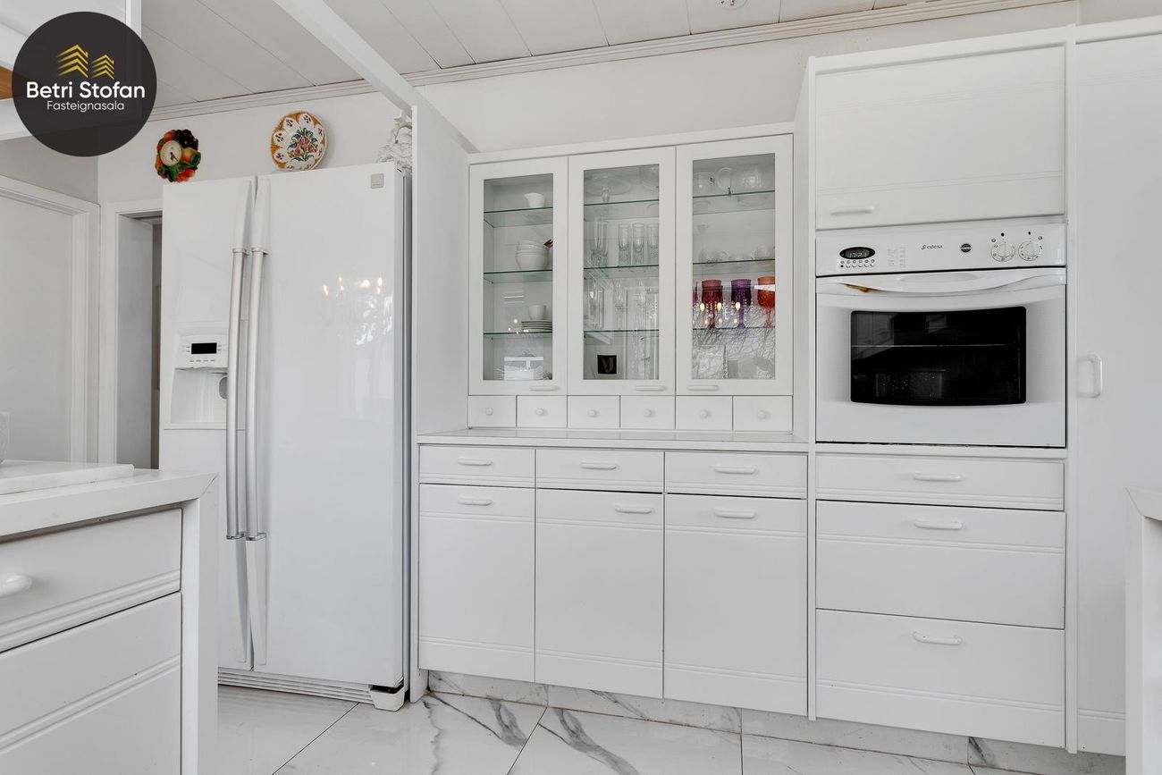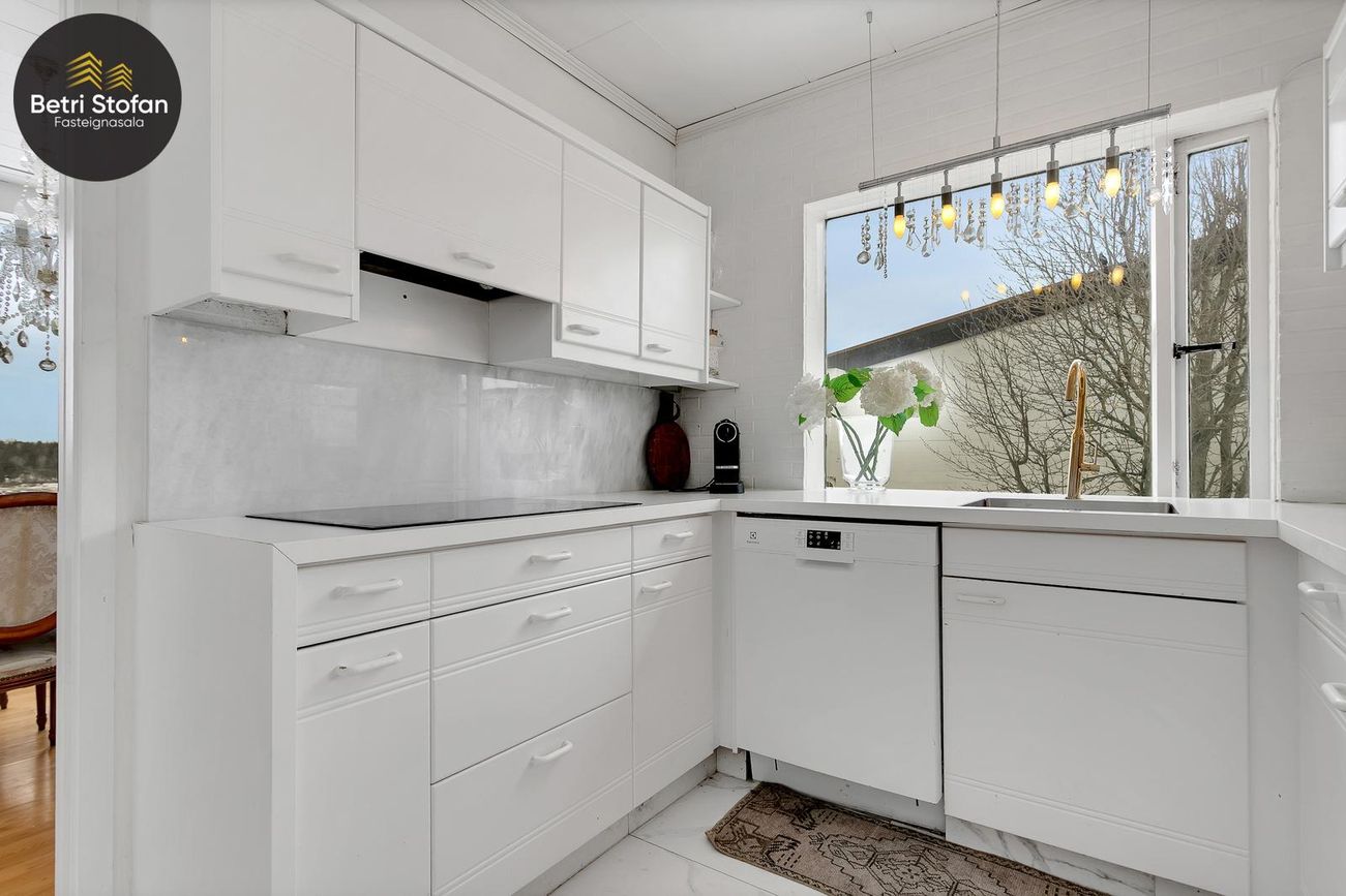 Eldhúsið er með hvítri innréttingu. Hvítar flísar á gólfi. Gengið inní eldhús úr holi og borðstofu.