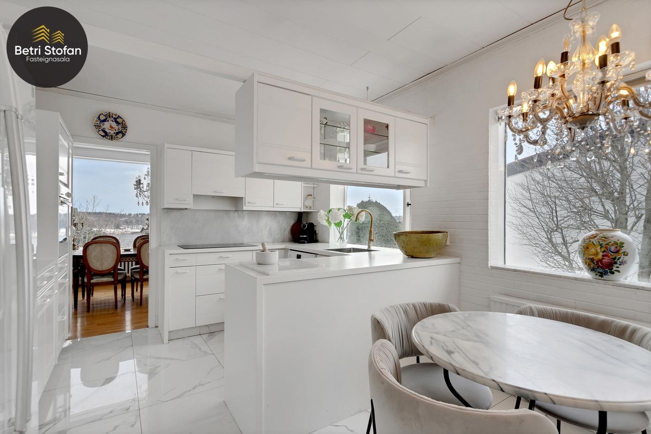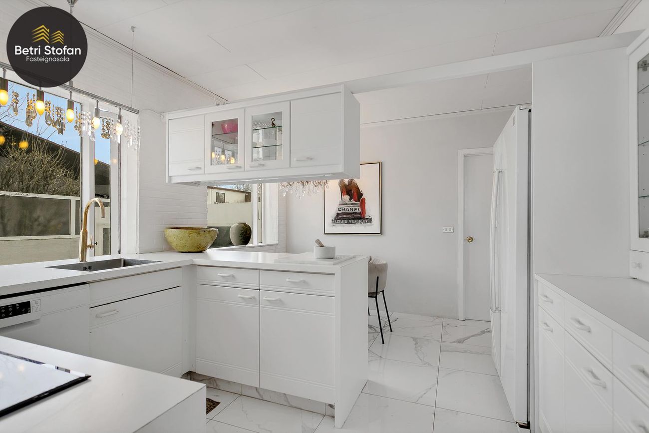 Eldhúsið er með hvítri innréttingu. Hvítar flísar á gólfi. Gengið inní eldhús úr holi og borðstofu.