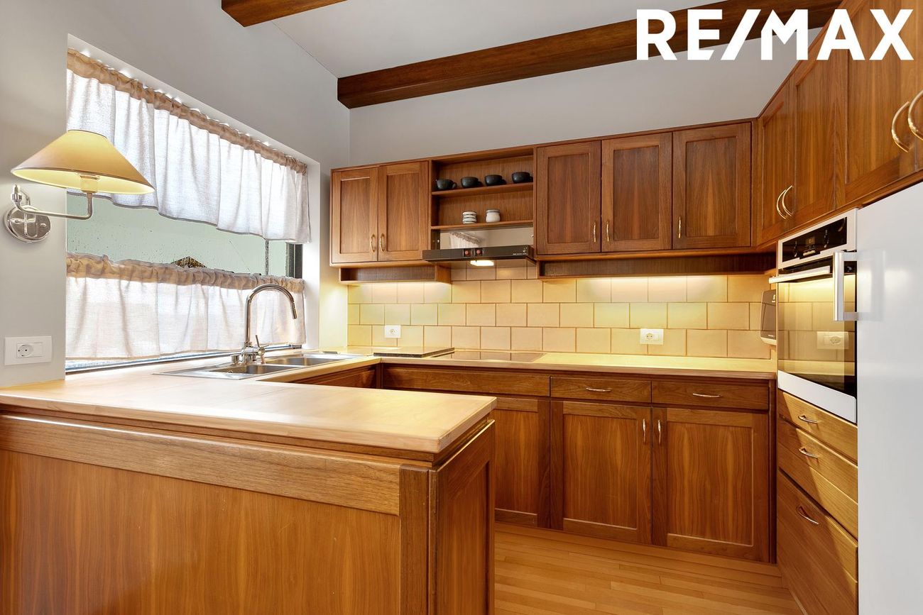 Viðarinnrétting með góðu skápaplássi, helluborði og björtum borðkrók. Innbyggt búr með hillum.