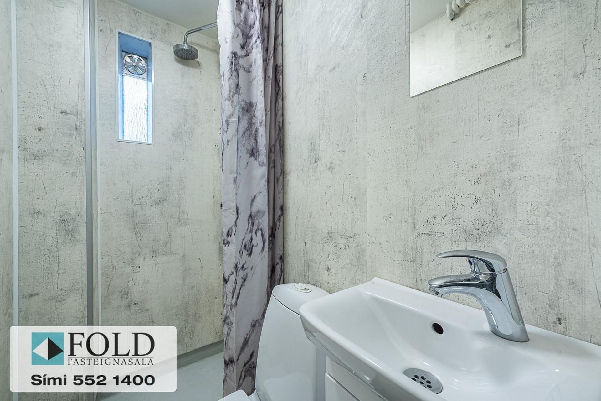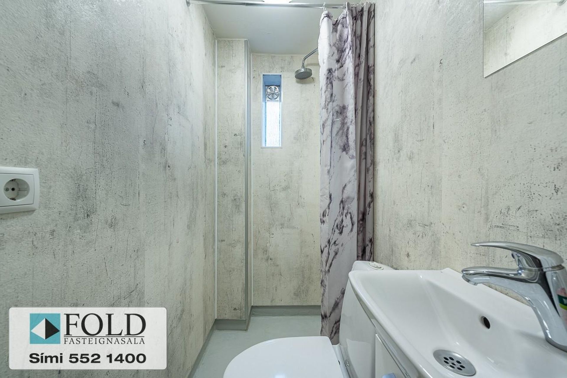 Baðherbergi er með sturtu og handlaug og lítilli innréttingu. Gengið er inná baðherbergið frá sameign.