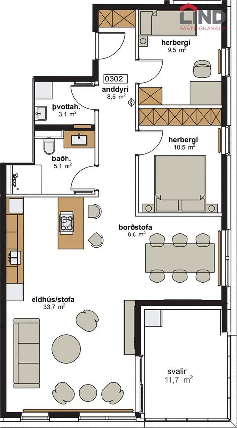 Íbúð 302: 96,9 fm 3-4ja herbergja íbúð á 3. hæð með þvottahúsi. Íbúðin er 96,9 fm þar af 5,3 fm geymsla