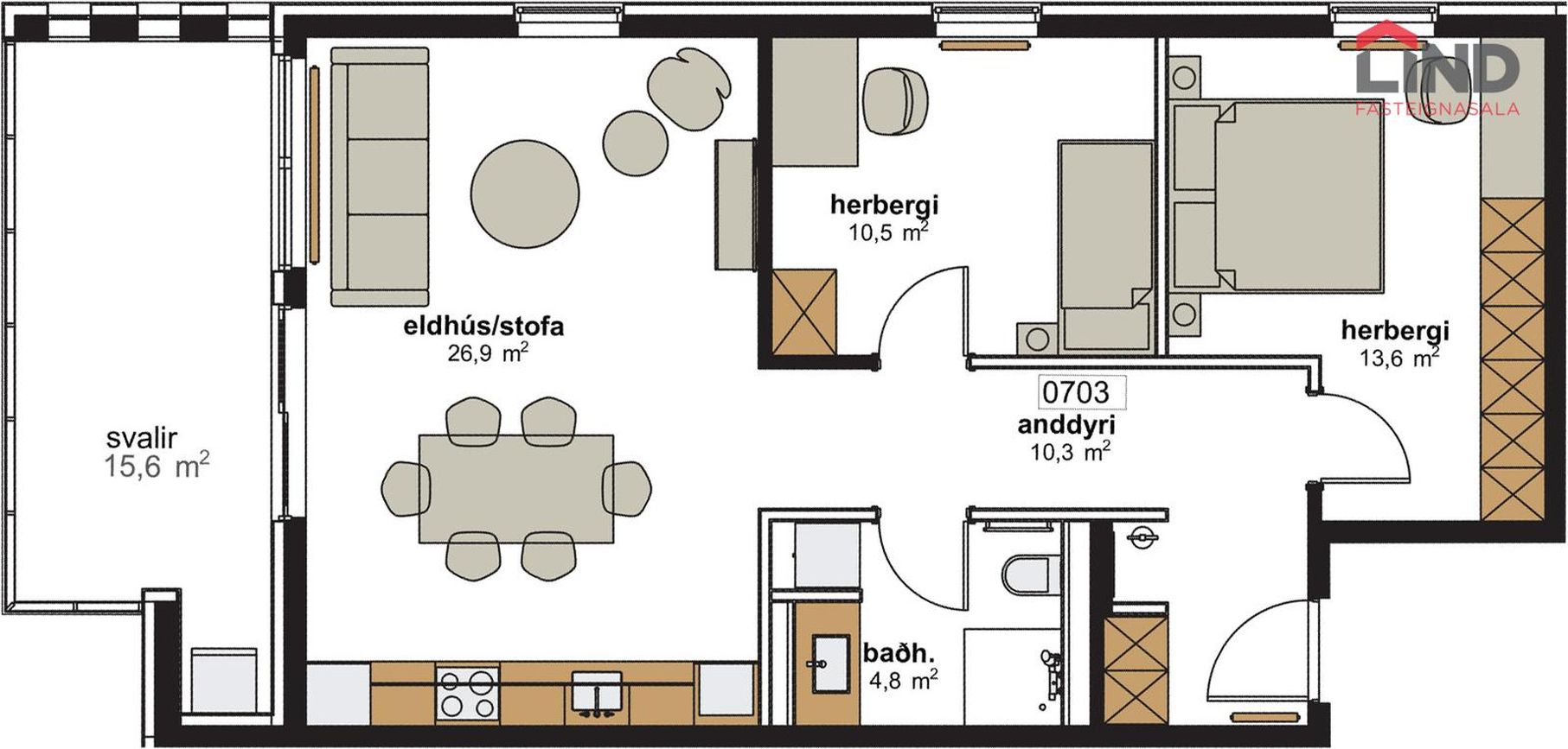 Íbúð 703 er þriggja herbergja með bílastæði í kjallara.
