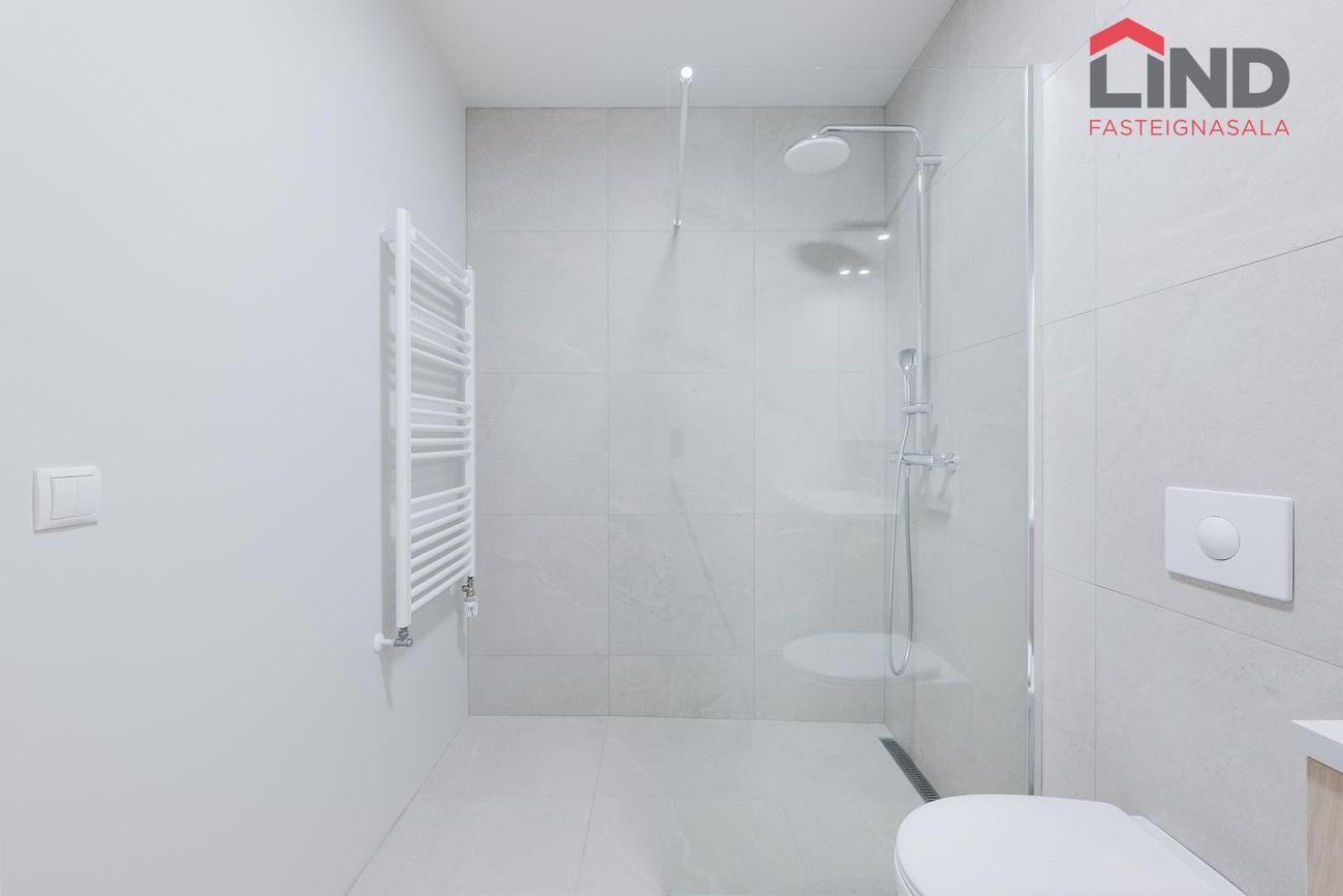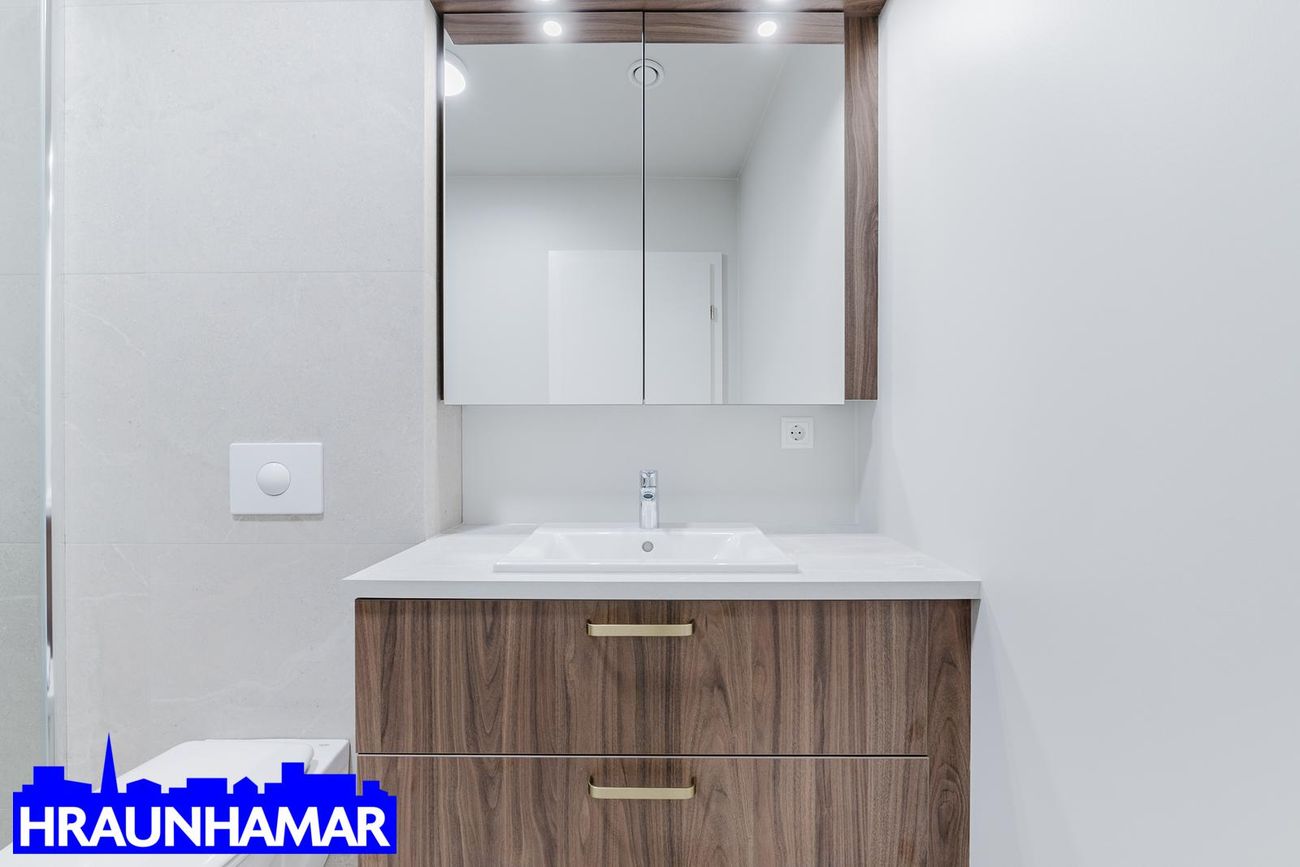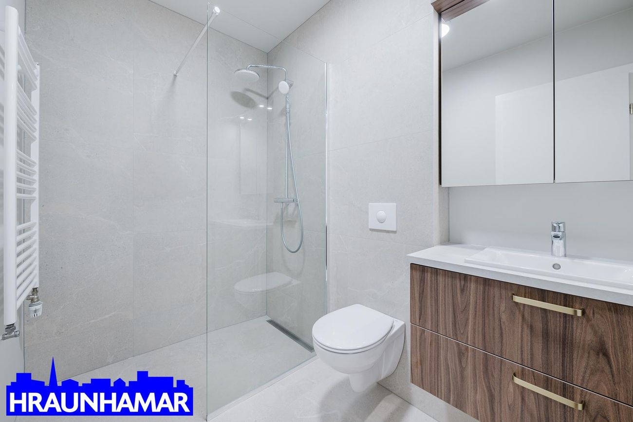 Baðherbergi: Baðinnrétting kemur frá Axis. Hreinlætistæki og handklæðaofn eru frá Byko. Salernið er upphengt og innbyggt. Hitastýrð blöndunartæki verða við sturtu. Gólf eru flísalögð og veggir að hluta upp í loft
