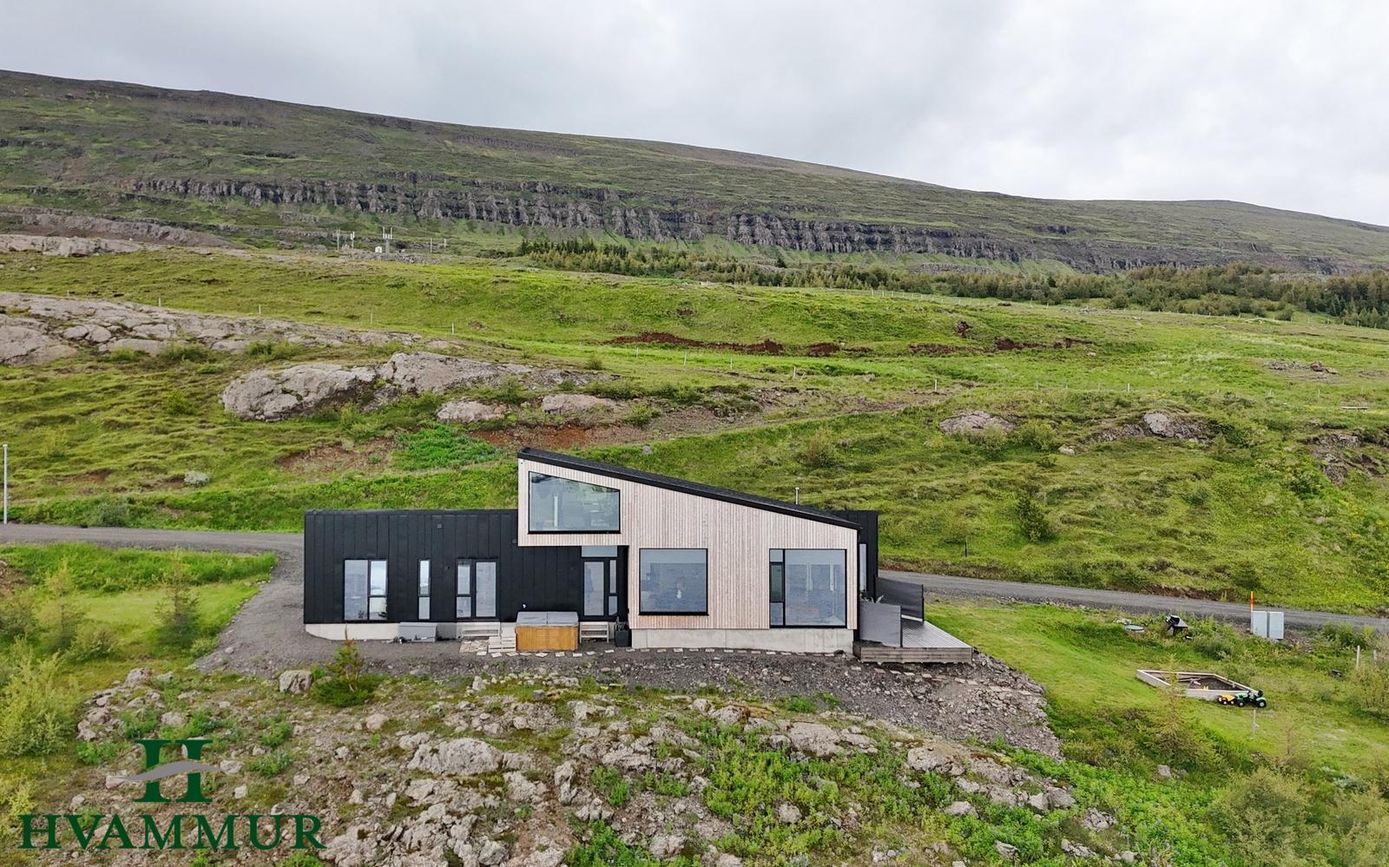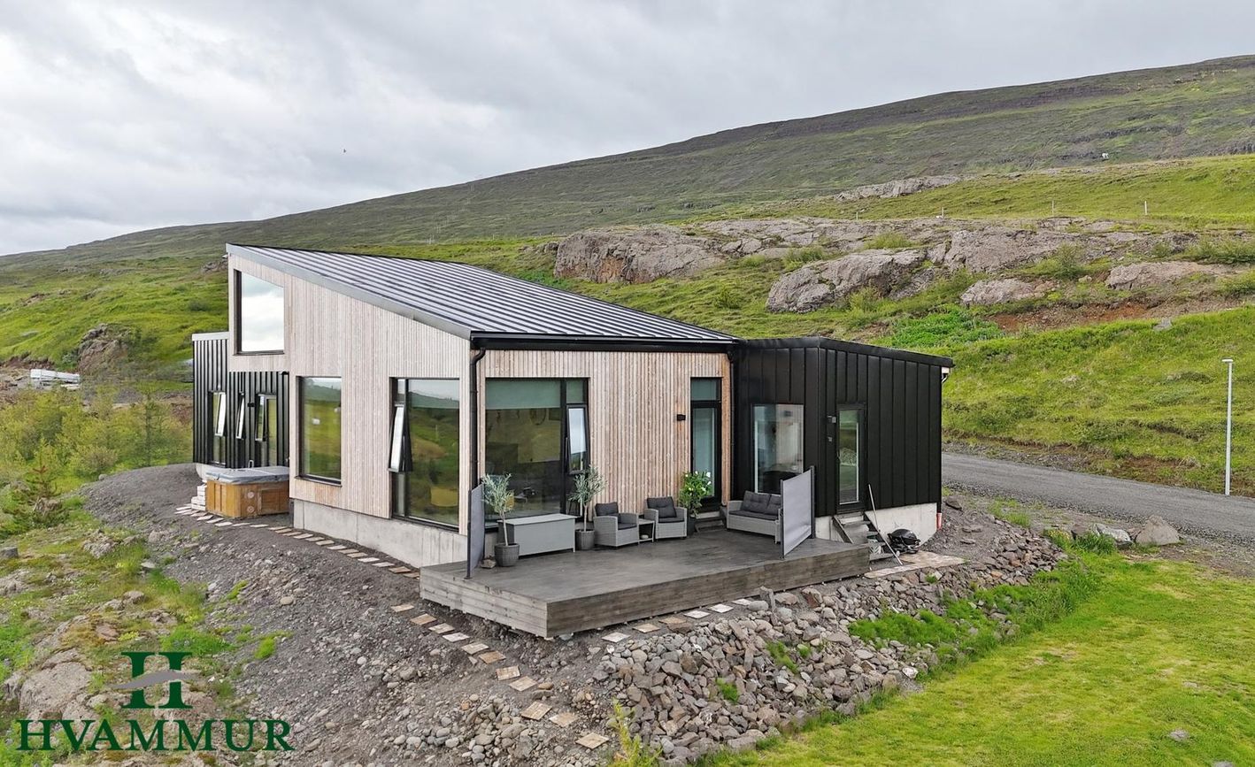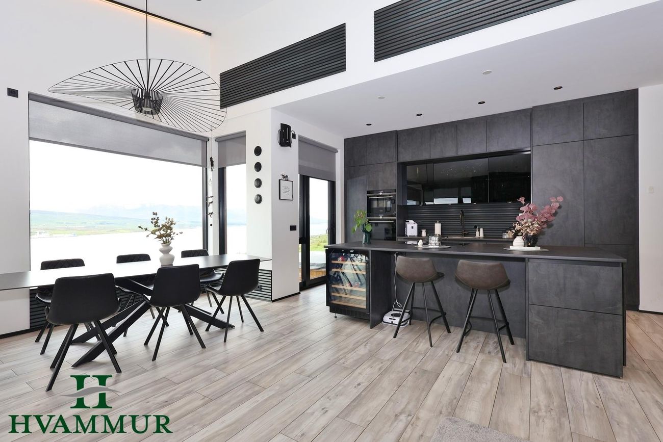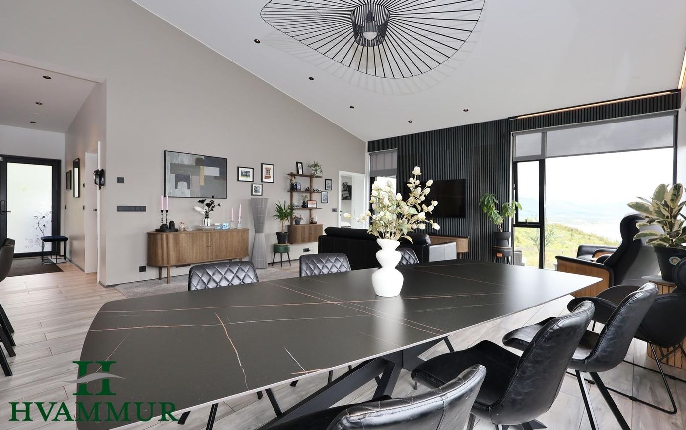 Tvö hæða timburhús byggt 2022 með glæsilegum útsýnisgluggum og opnu rými. Klætt að utan með svörtu áli og timbri.