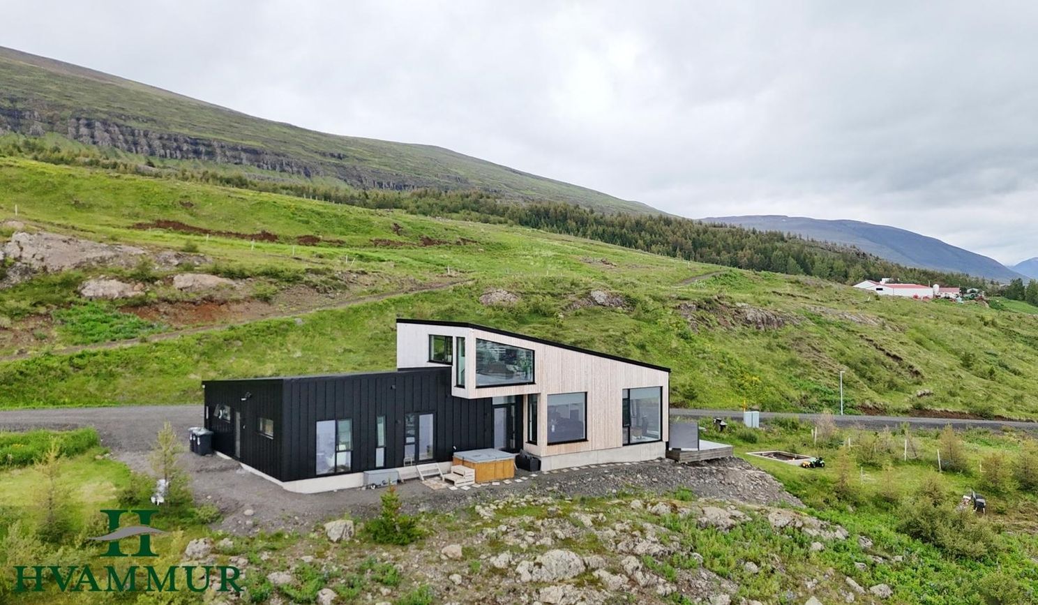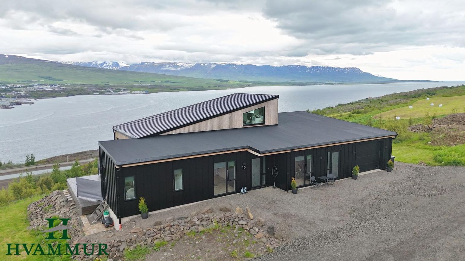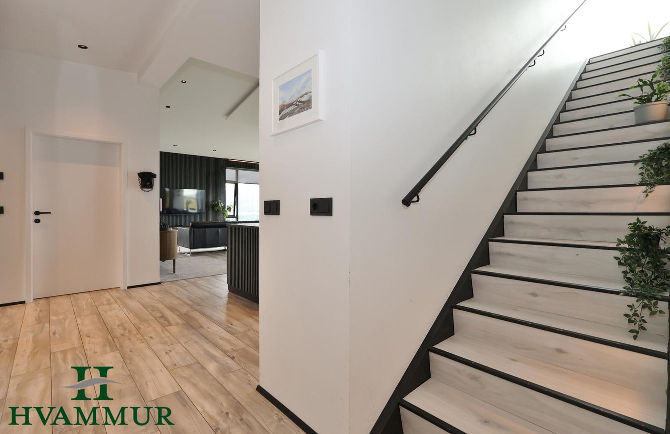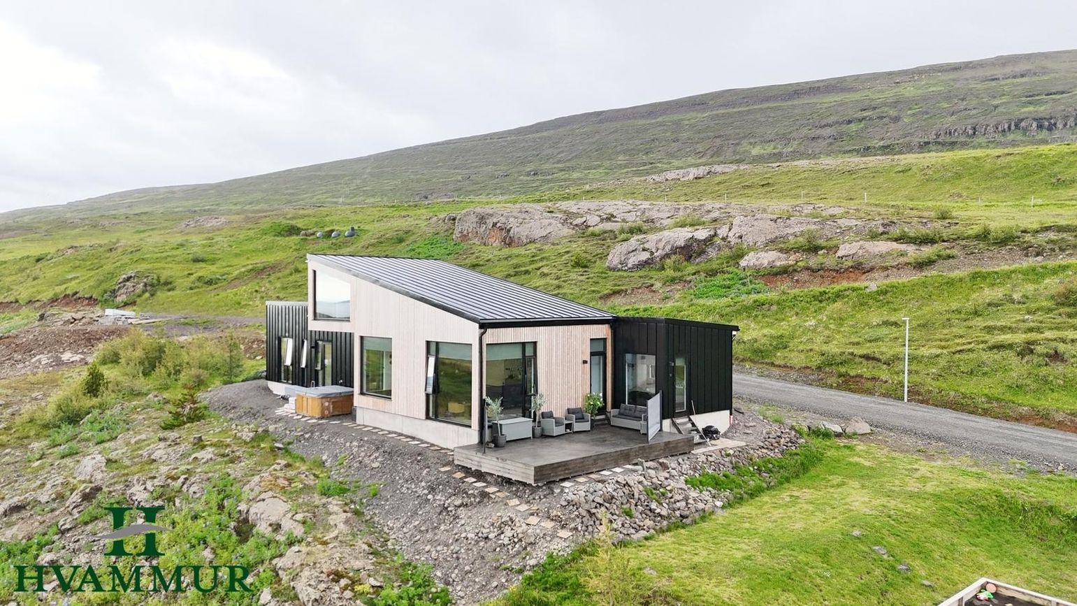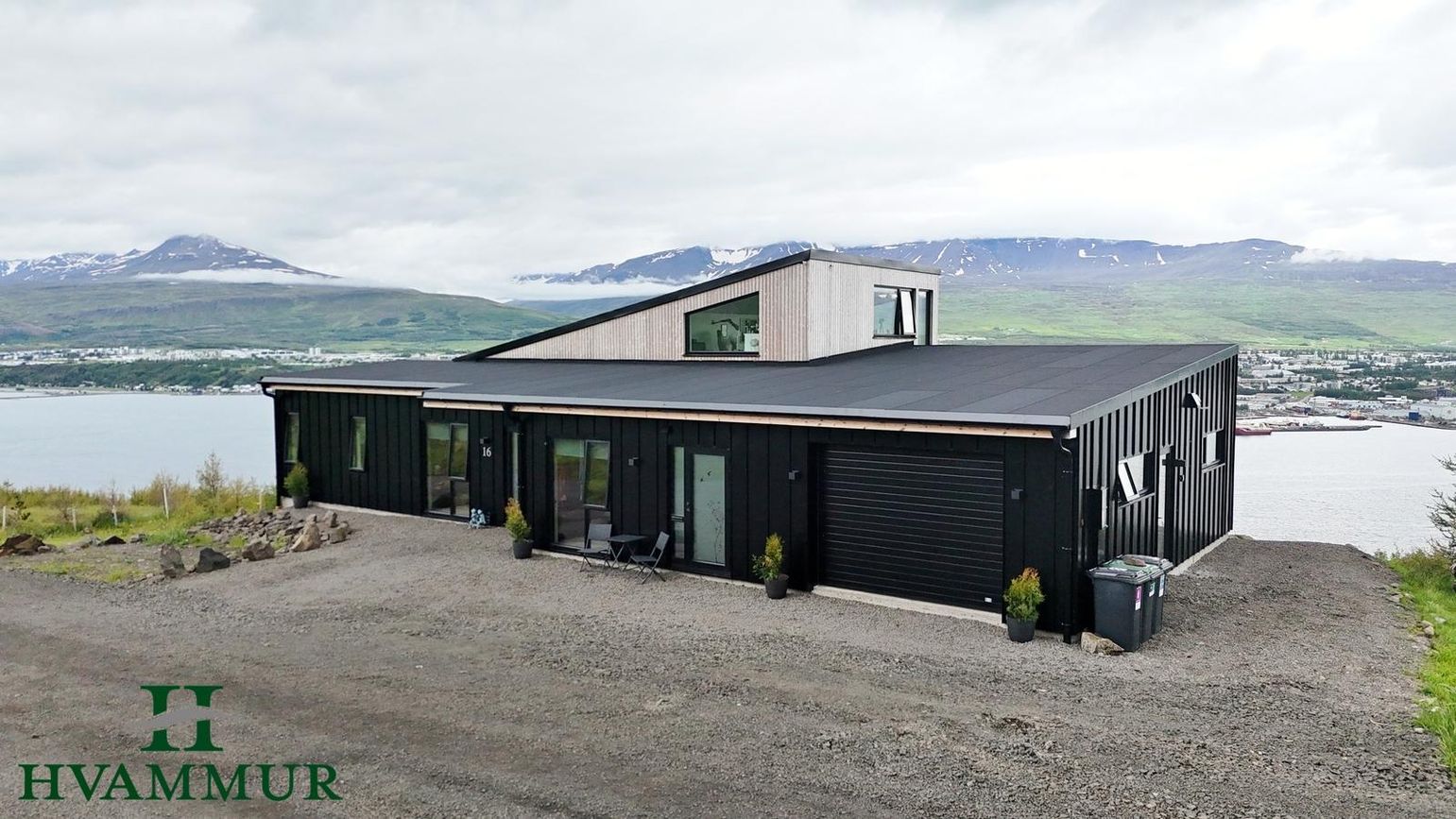 Tvö hæða timburhús byggt 2022 með glæsilegum útsýnisgluggum og opnu rými. Klætt að utan með svörtu áli og timbri.