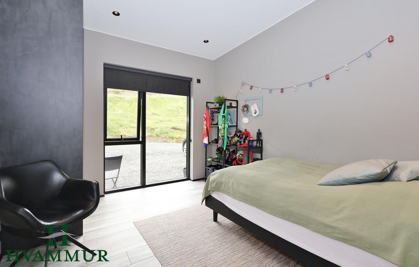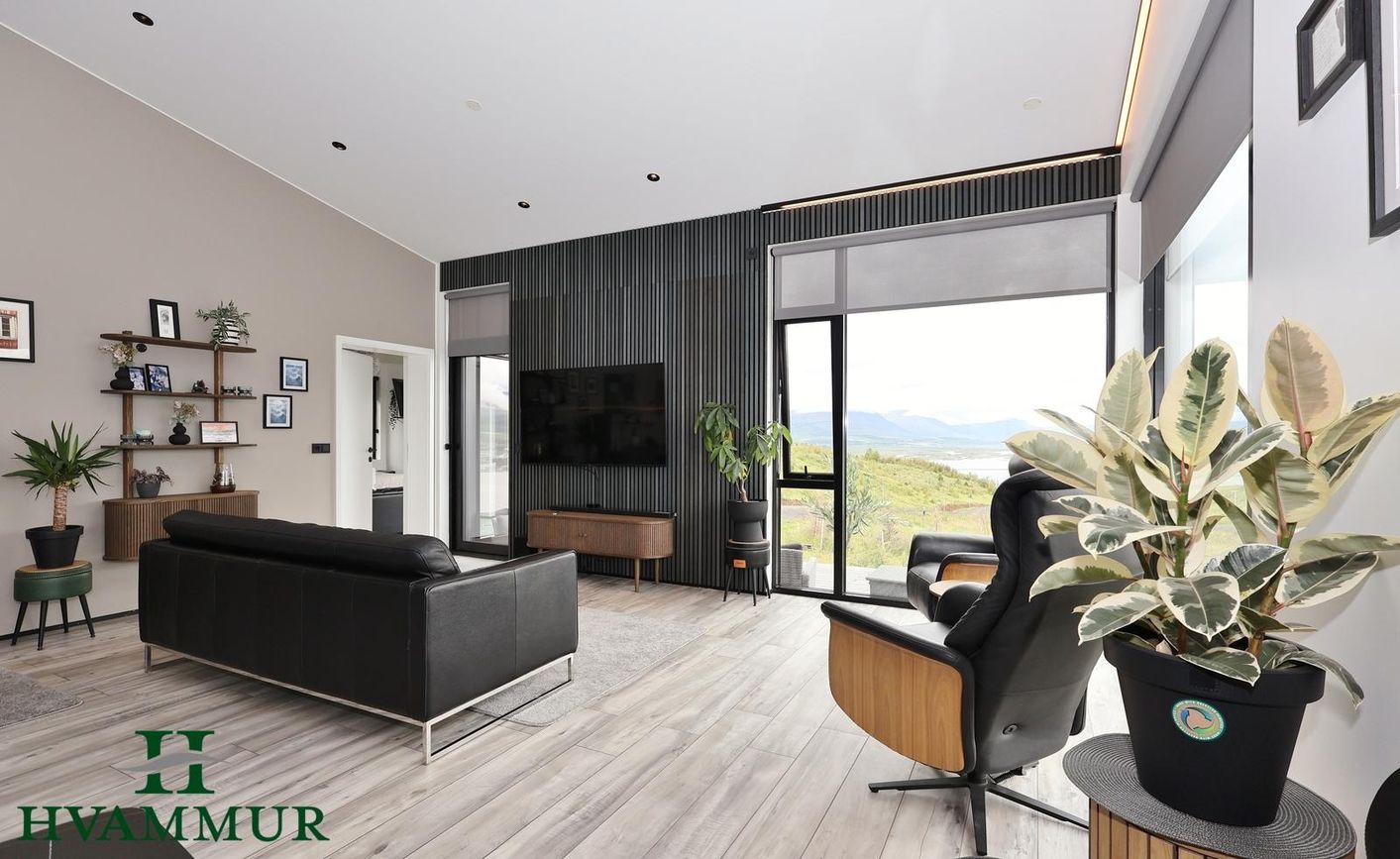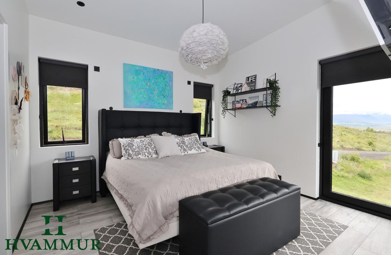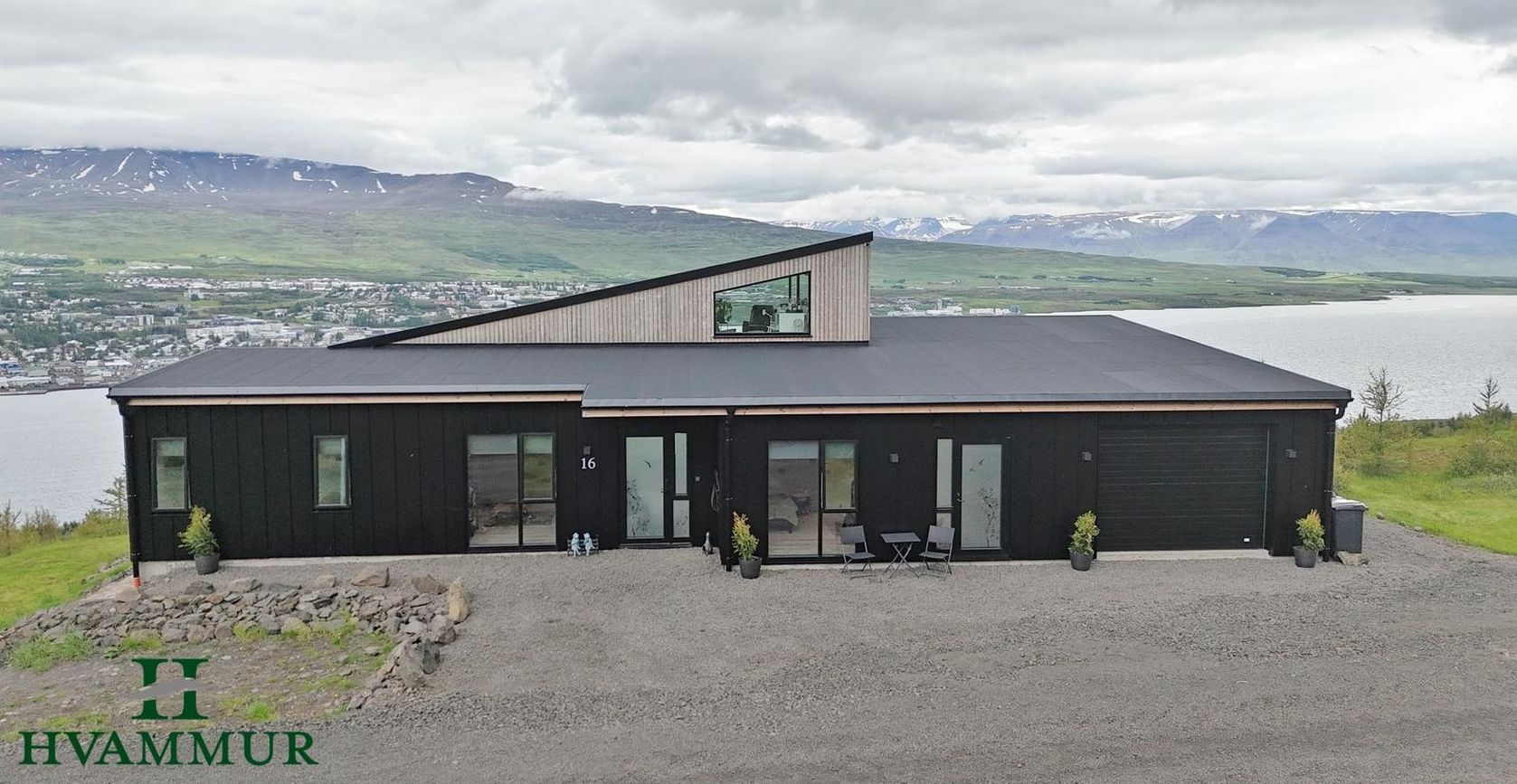 Tvö hæða timburhús byggt 2022 með glæsilegum útsýnisgluggum og opnu rými. Klætt að utan með svörtu áli og timbri.