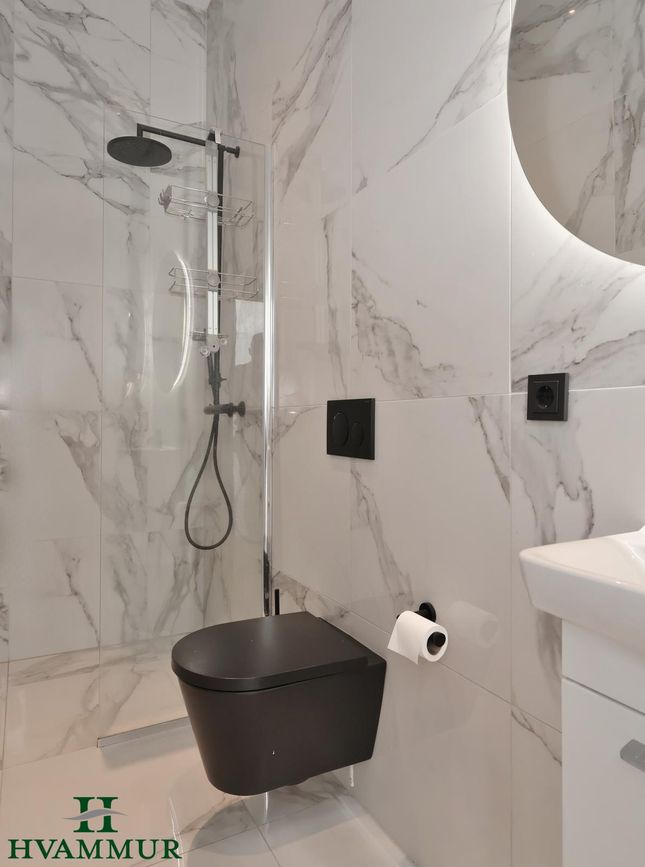 Marmerlituð flísalegn í baðherbergi með tveimur handlaugum, tvöfaldri walk-in sturtu og upphengt wc.
