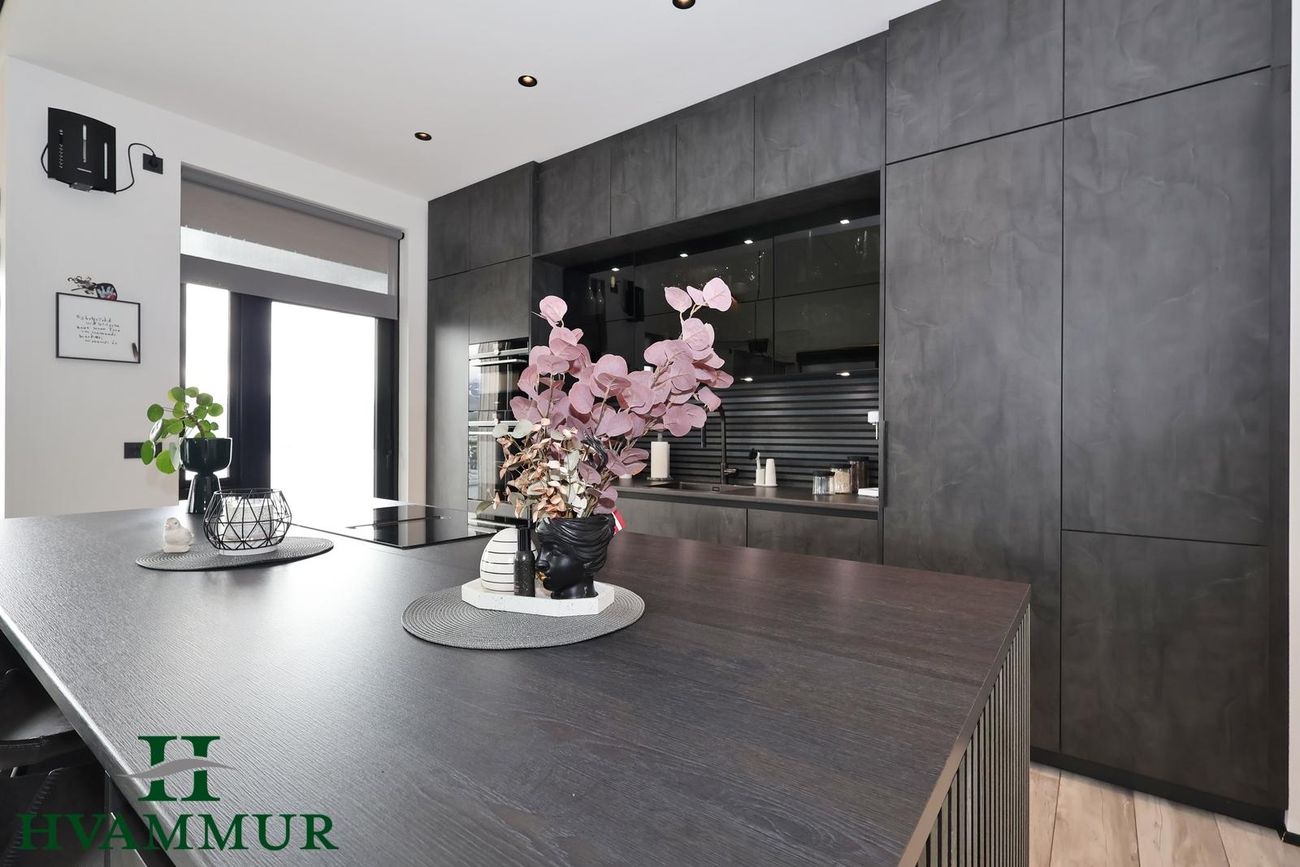 Dökk grá innrétting með stórri eyju, innföldum ísskáp og uppþvottavél, vínkæli og útgangur til vesturs.