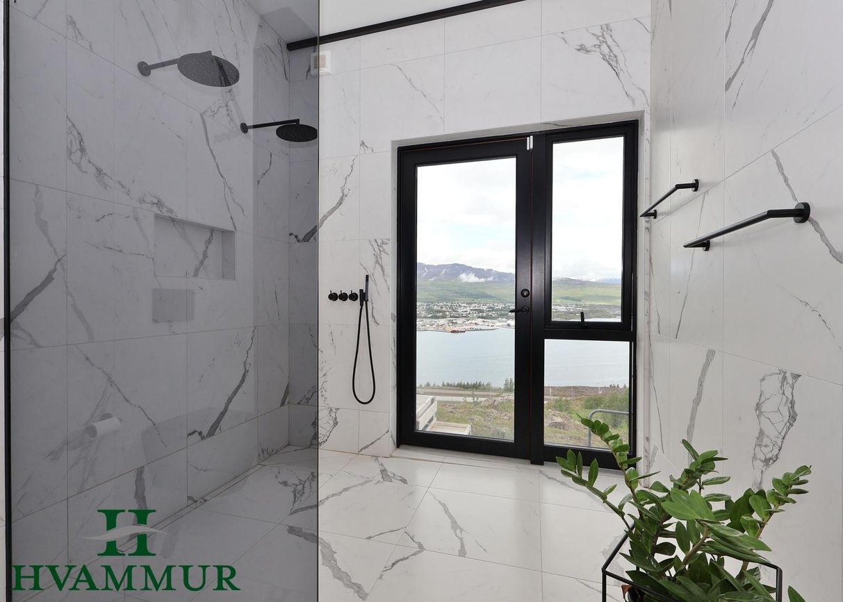 Timburbygging með svörtu áli, þreföldu gleri og marmaralituðum flísum.