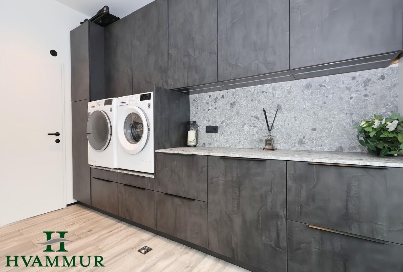 Innfelldur ísskápur, uppþvottavél, vínkælir, pláss fyrir þvottavél/þurrkara.
