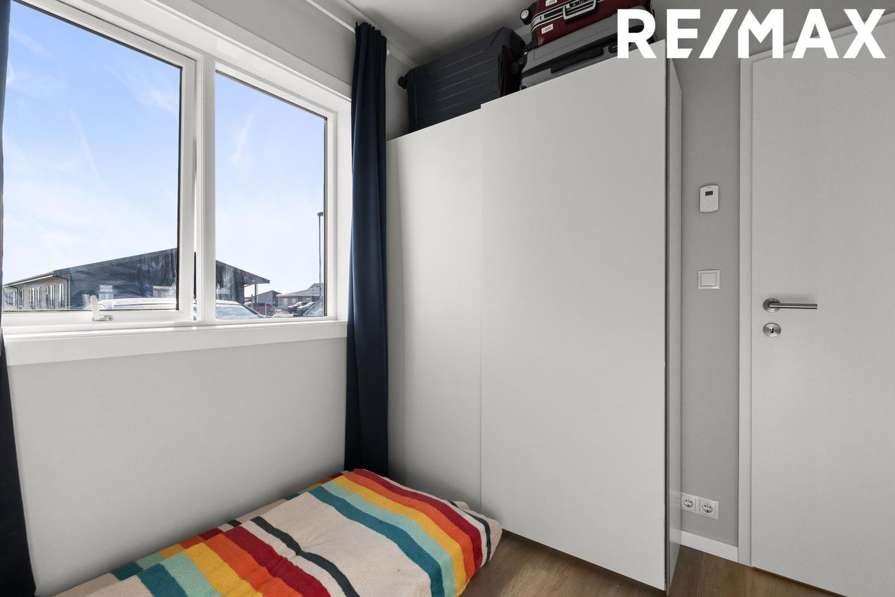 Herbergi 2# er rúmgott með vínilparket á gólfi og fataskáp.
