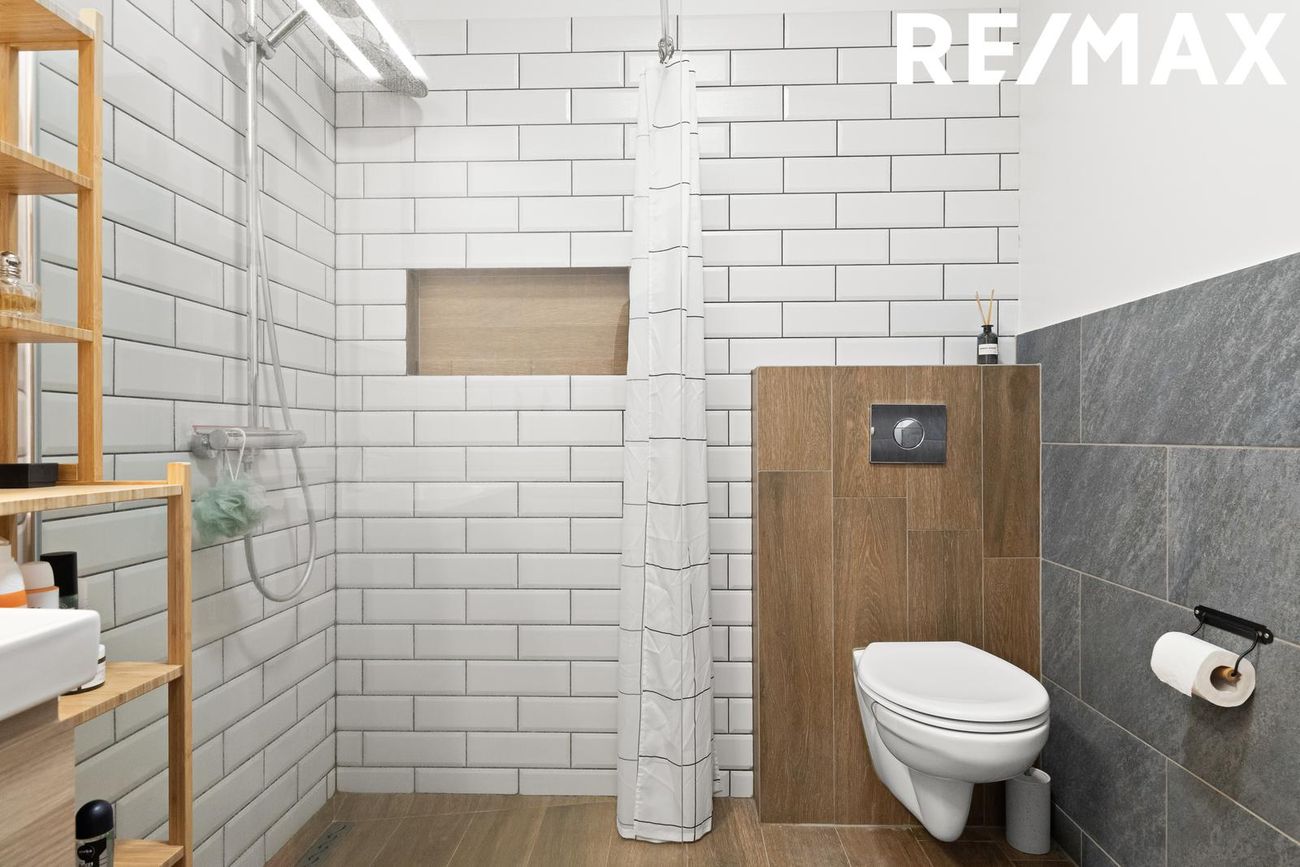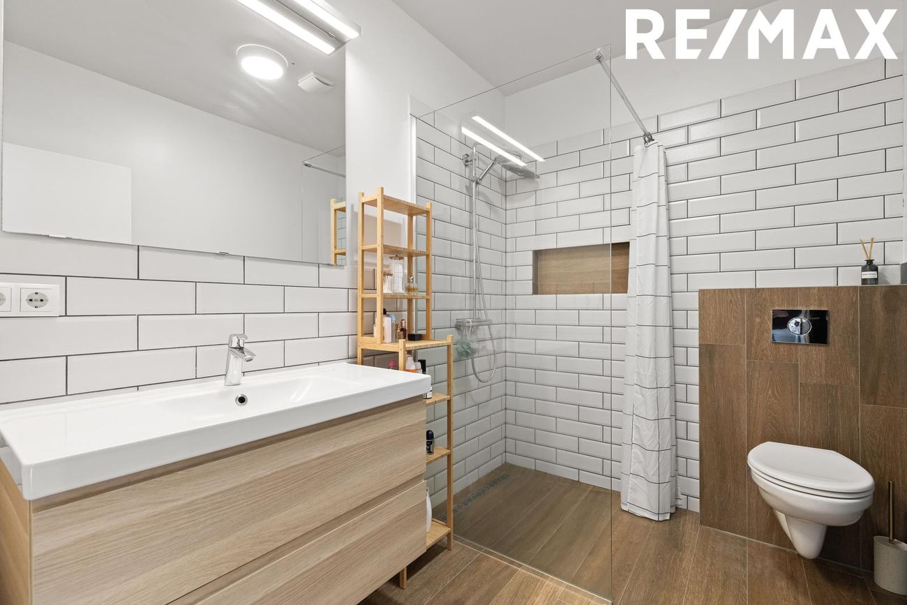 Baðherbergi er flísalagt, innbyggt vegghengt salerni. Baðinnrétting er rúmgóð og walk in sturta.
