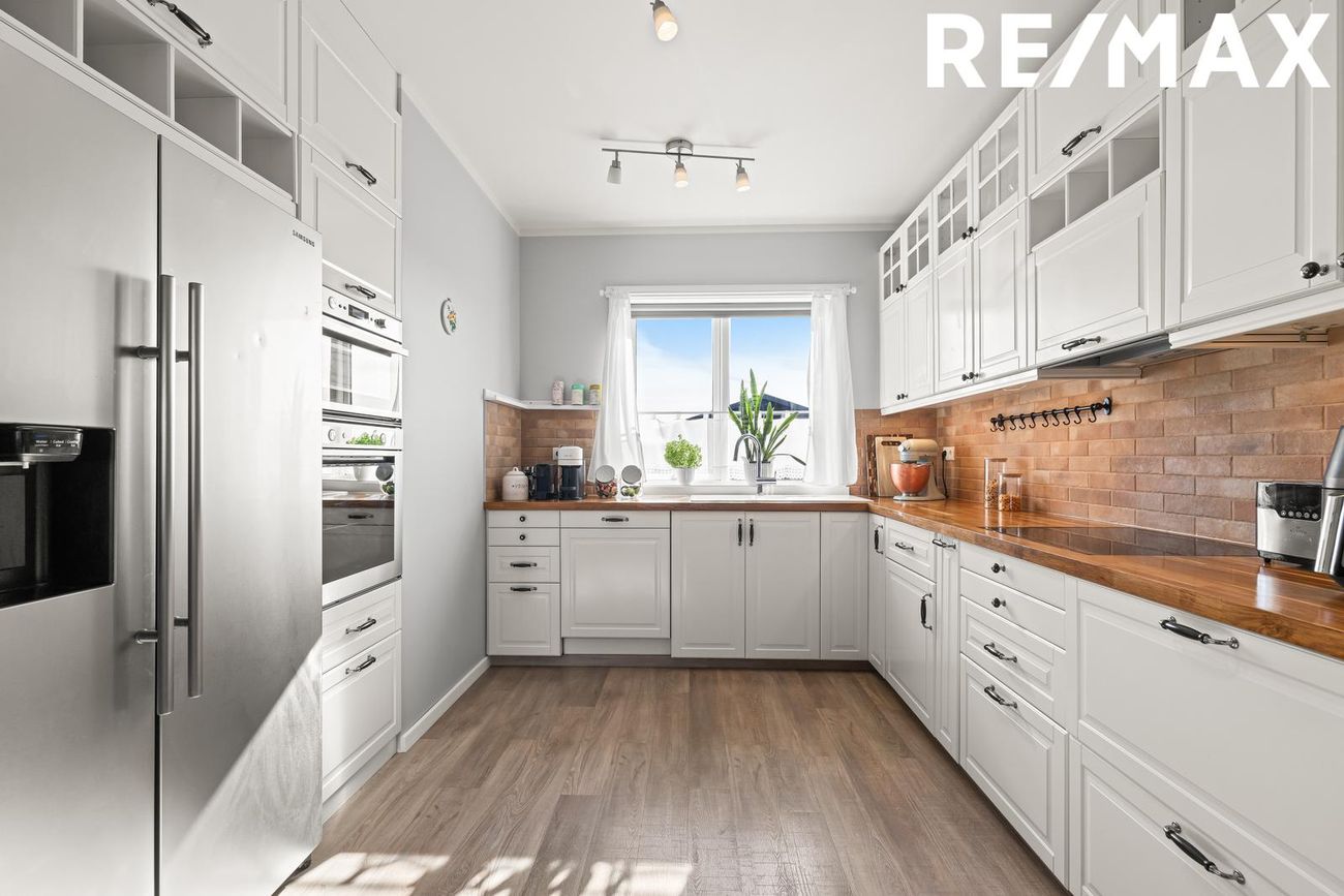 Eldhús: Eldhúsinnréttingin er með góðu skápaplássi og innbyggð uppþvottavél.