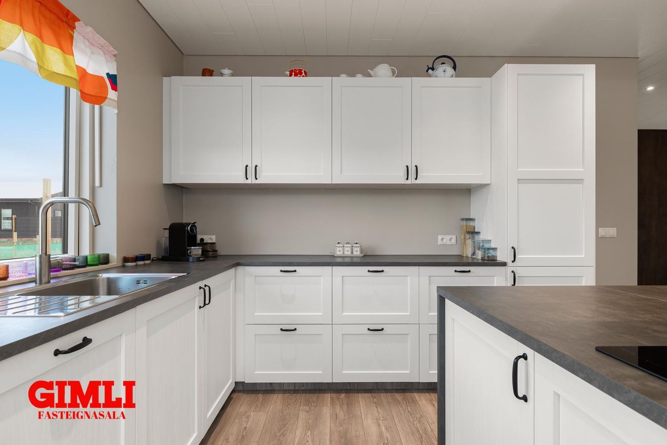Innbyggður ísskáp, uppþvottavél, eldunareyja með bakaraofni.