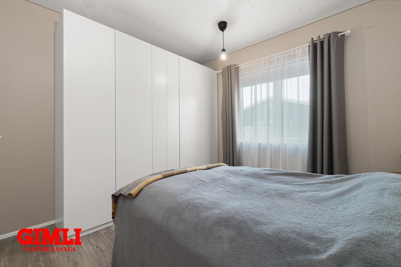 Innbyggður bílskúr með innkeyrsluhurð, glugga, útgönguhurð í garð og málað gólf. Hægt að breyta í fjórða herbergi.