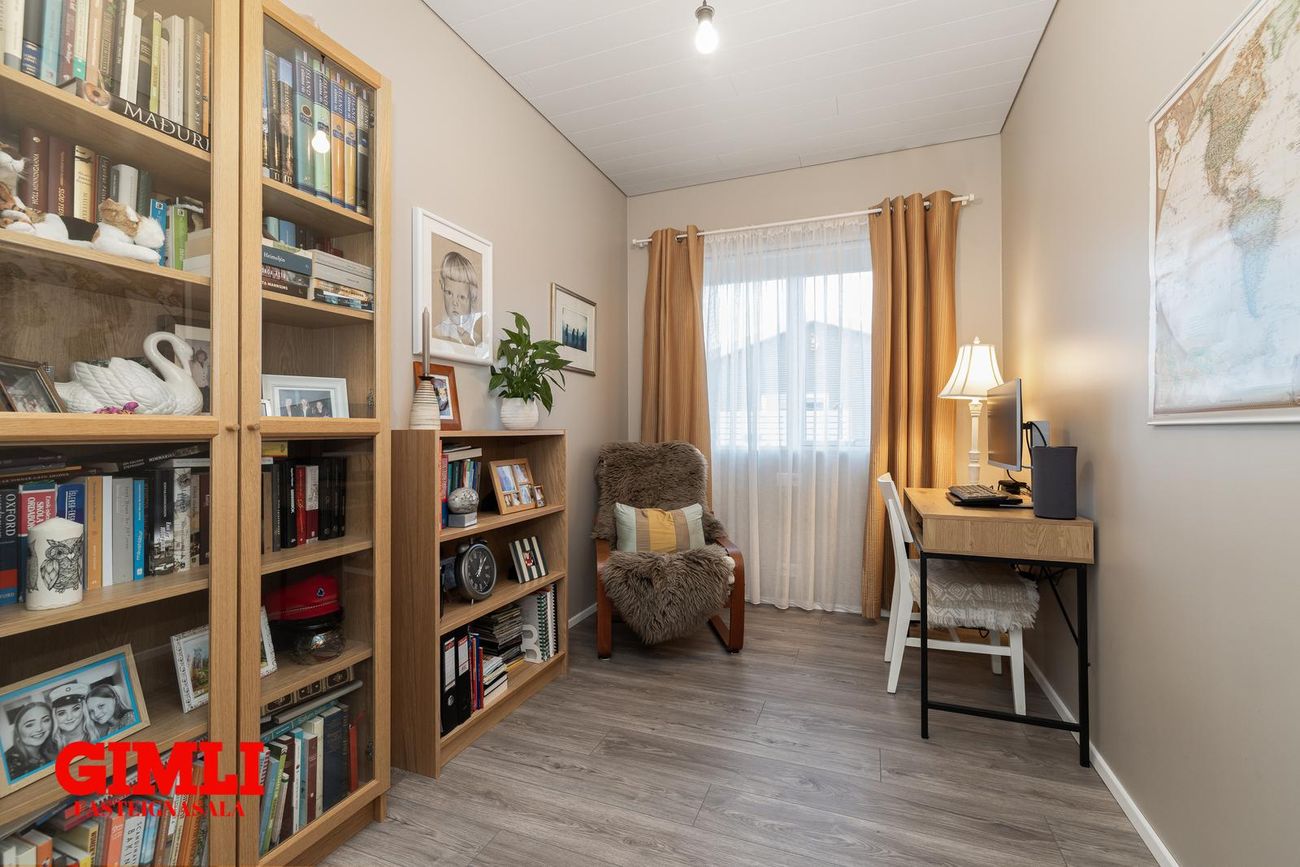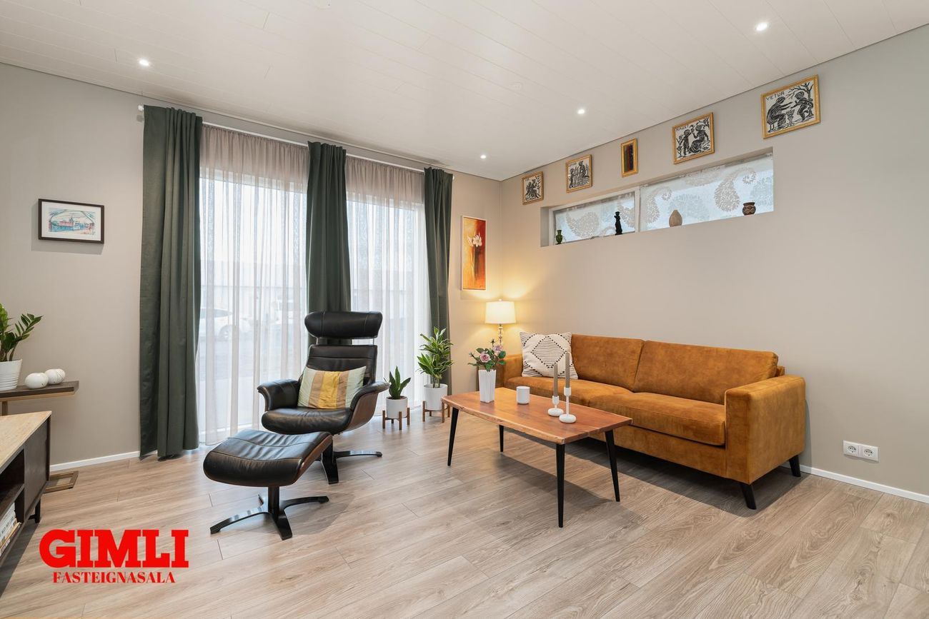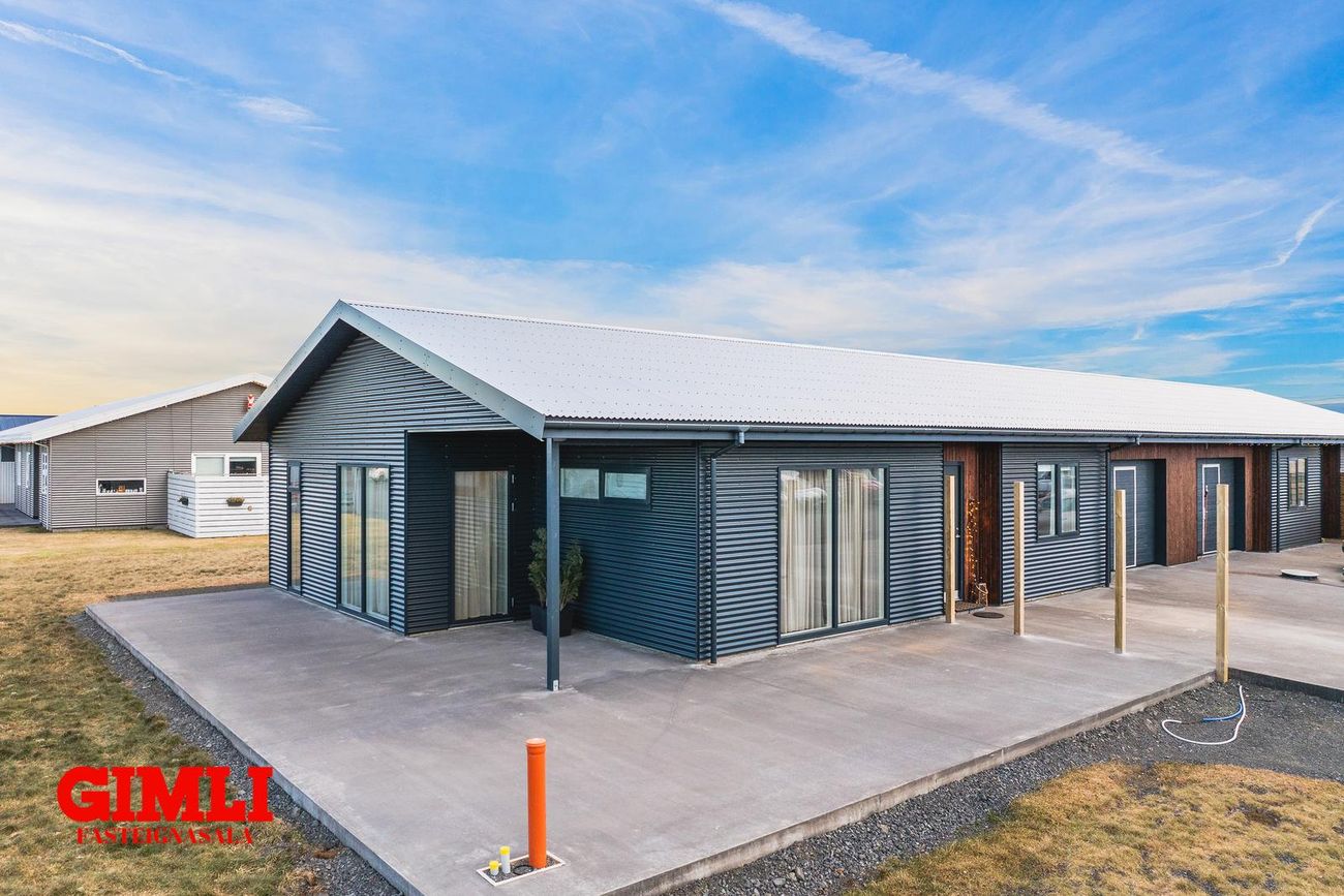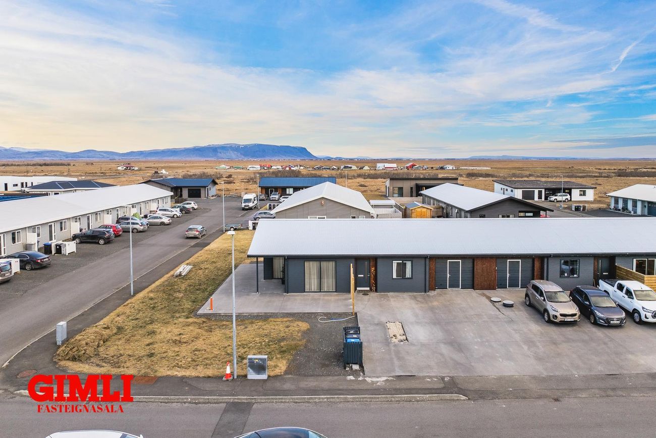 Parhús á einni hæð með forstofu, stofu, stóru eldhúsi, baðherbergi, þremur svefnherbergjum, þvottahúsi, háalofti og bílskúr sem hægt er að breyta í fjórða herbergi. Harðparket og flísar á gólfum.