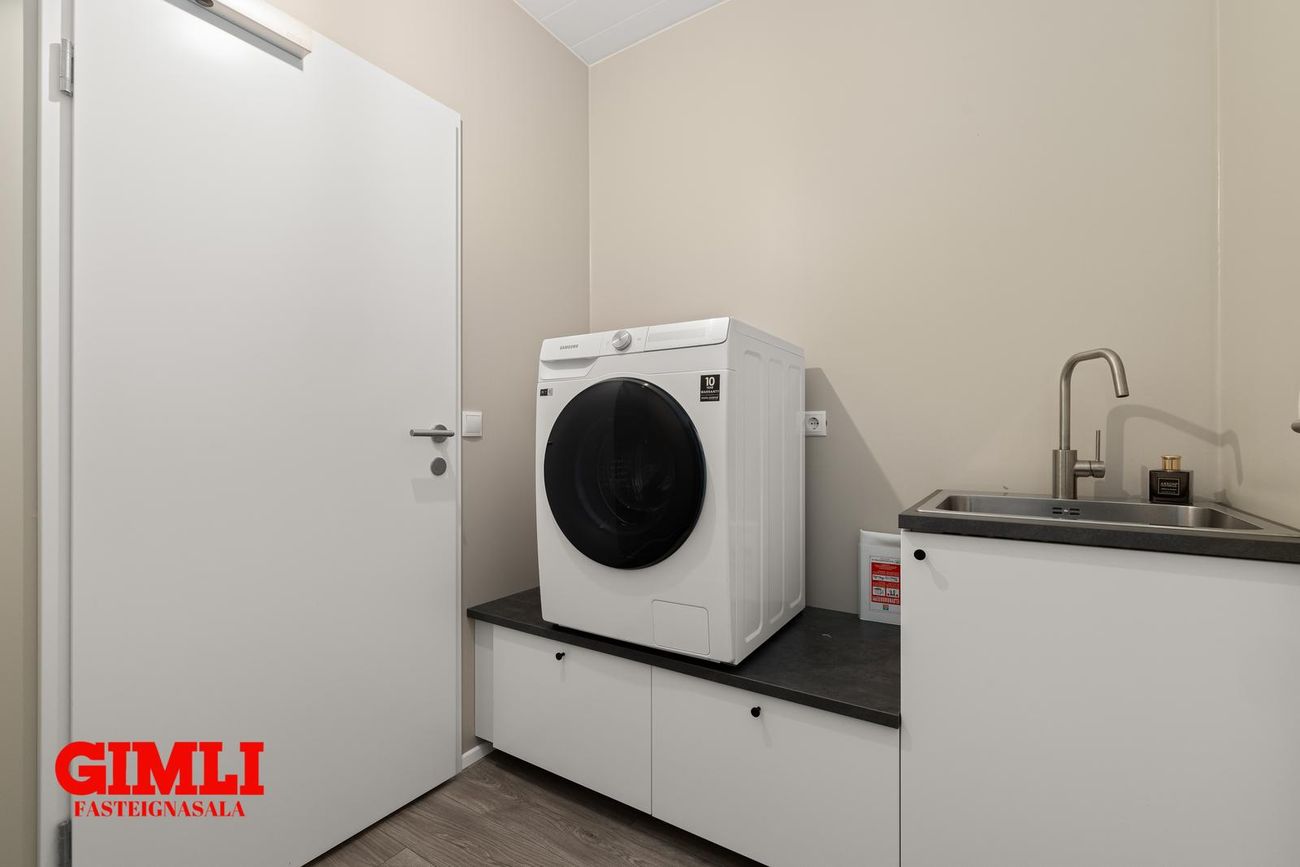 Þvottahús með plássi fyrir þvottavél og þurrkara, vaskur