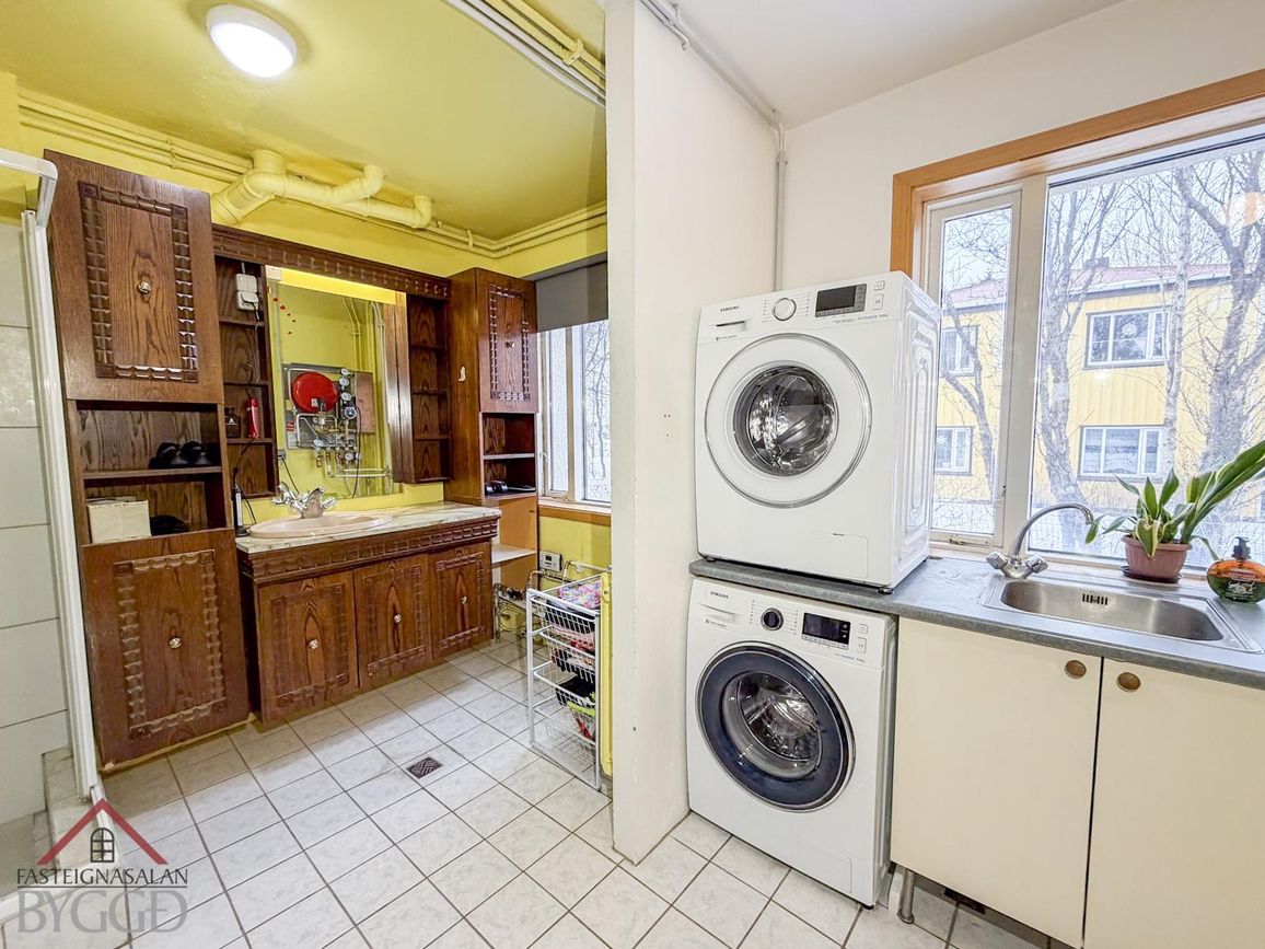 Stórt þvottahús með þvottavél, þurrkara og vask. Útganga út í garð.