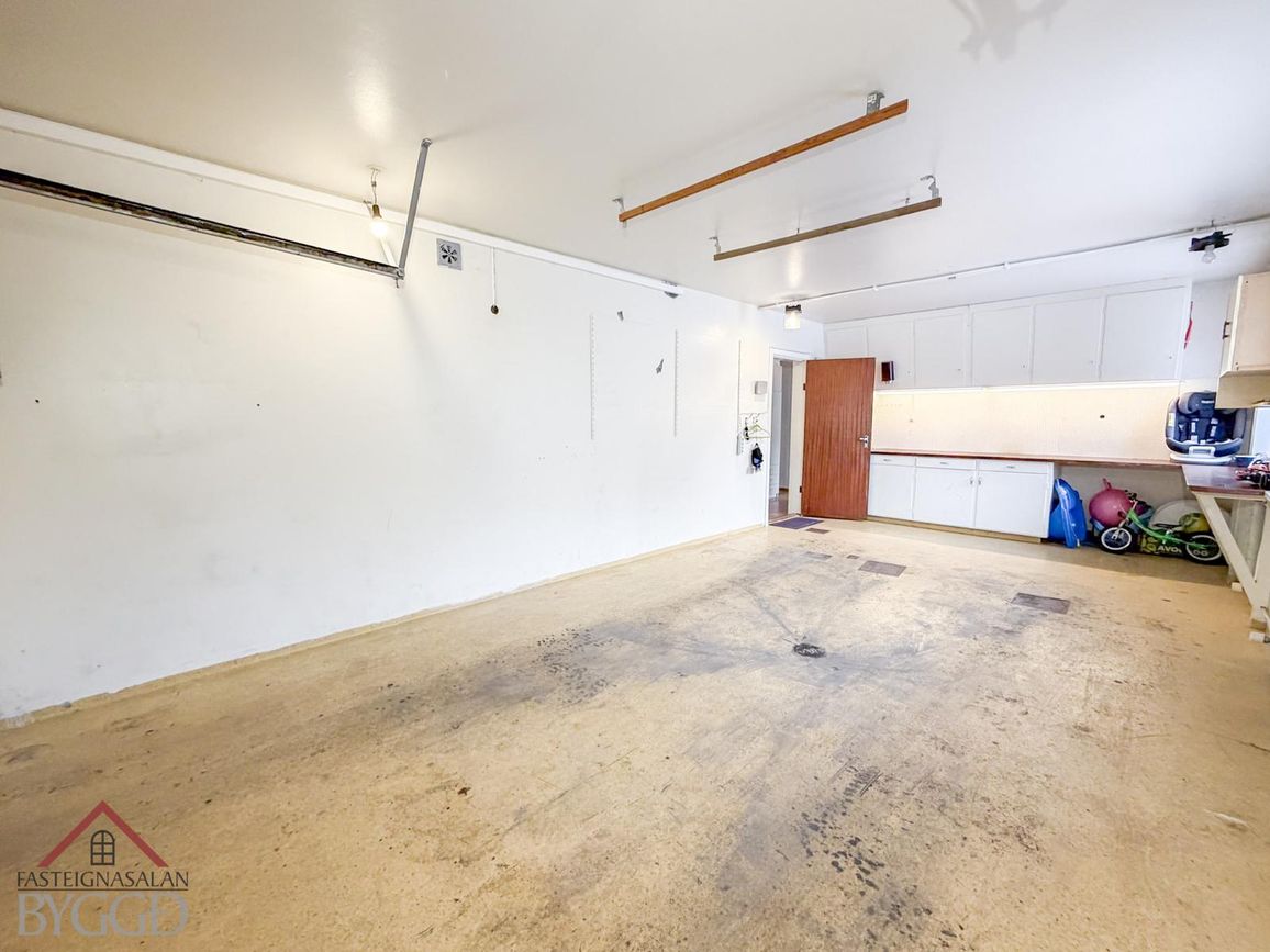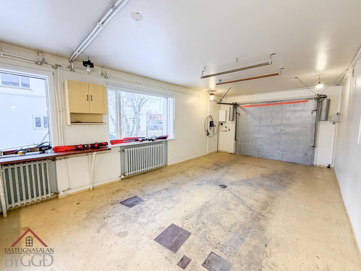 Stór bílskúr með plássi fyrir hleðslustöð. Bjart og rým.