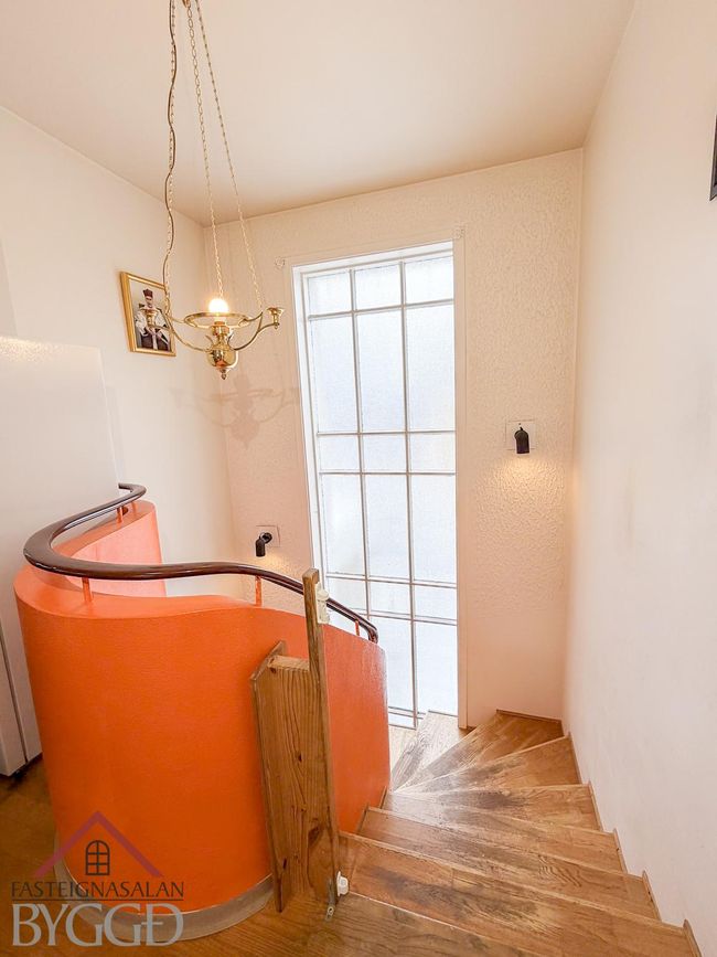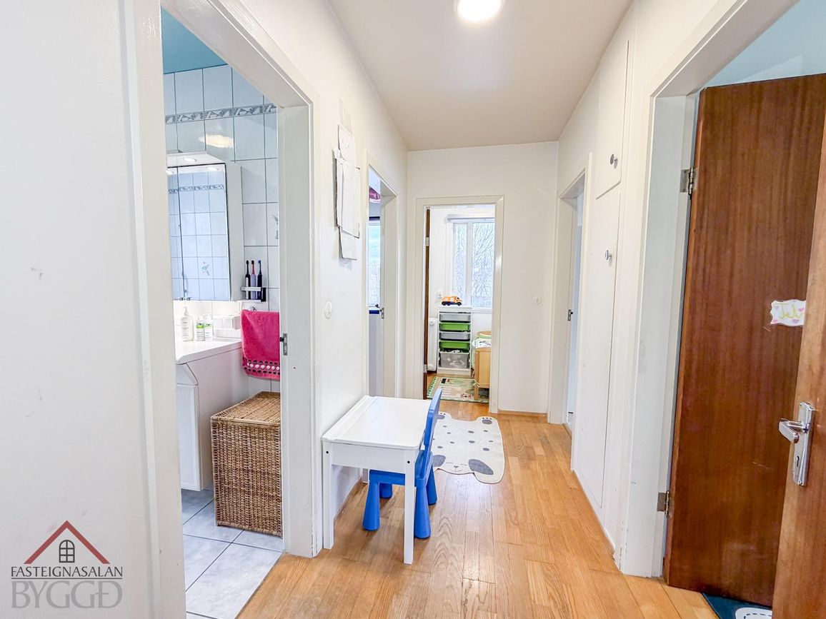 Steinklædd framhlið, parketgólf og flísalög gólf í baðherbergjum.