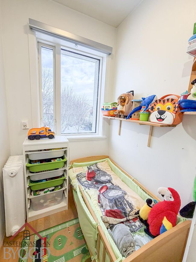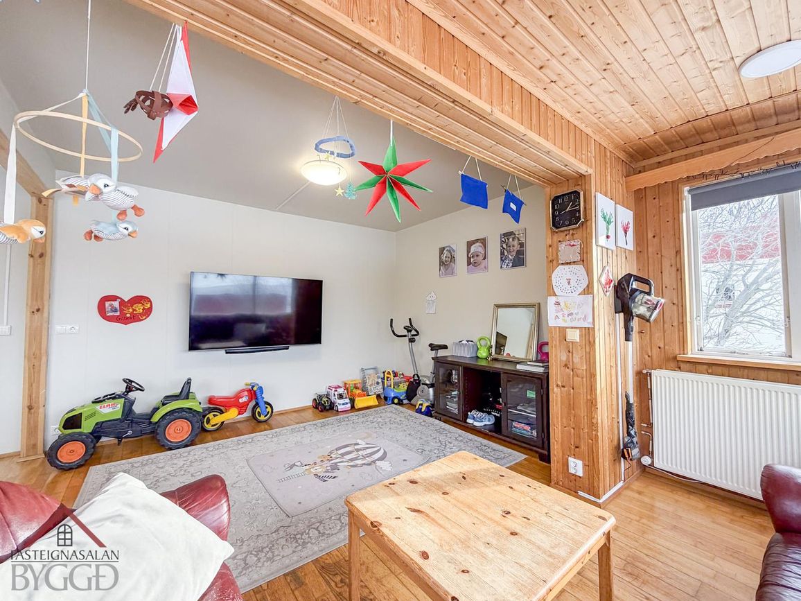 Björt stofa með parketgólfi og opnu rými. Svefnherbergi með skápaplássi.