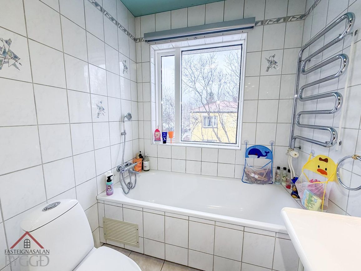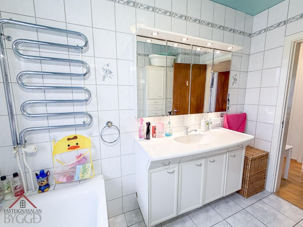 Baðherbergi með flísalögum gólfum, baðkeri, handklæðaofni og hvítum innréttingum.