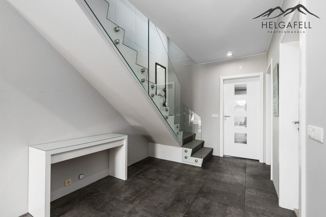 Efri hæð.Steyptur stigi milli hæða er teppalagður með nýlegu kókosteppi. Hert gler setur fallegan svip á stigann.