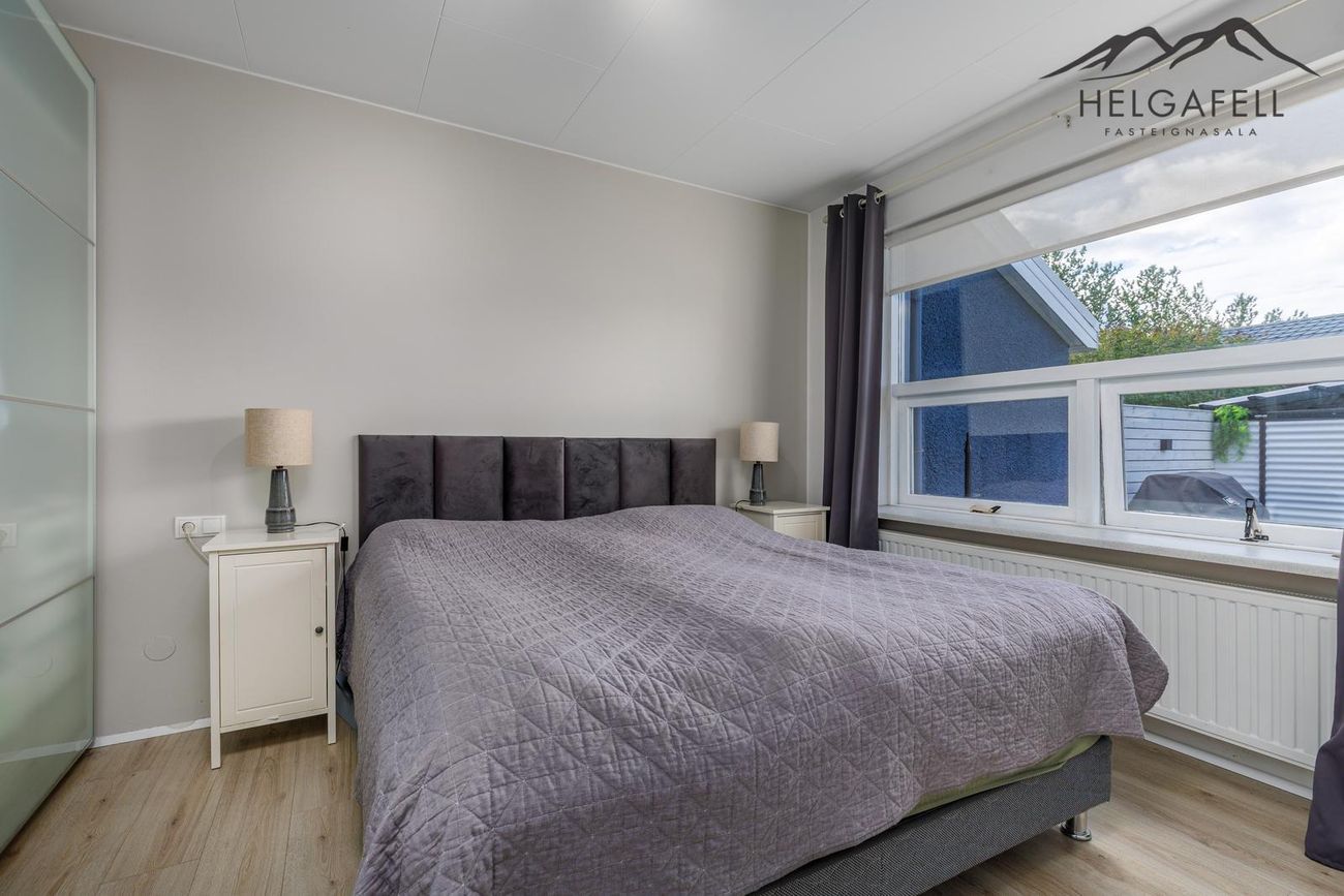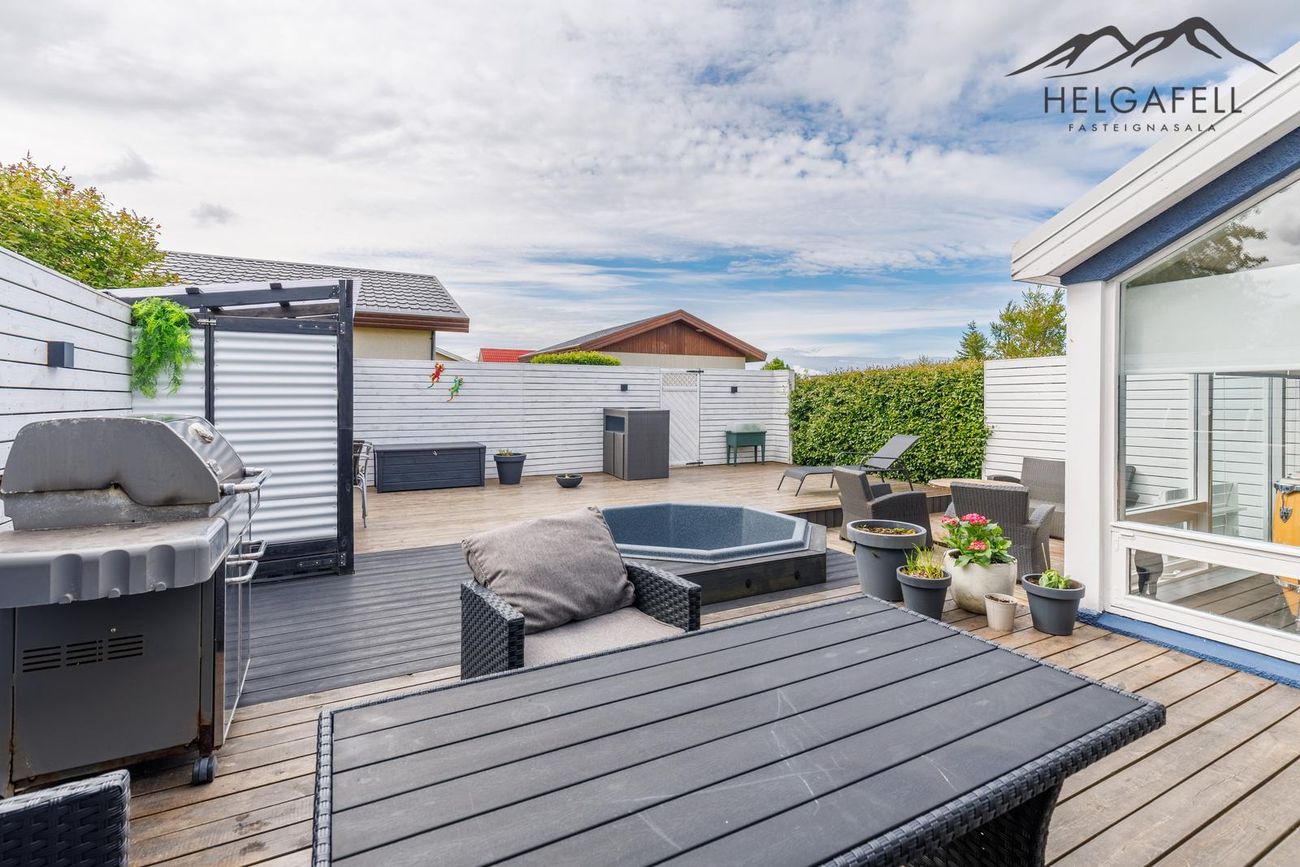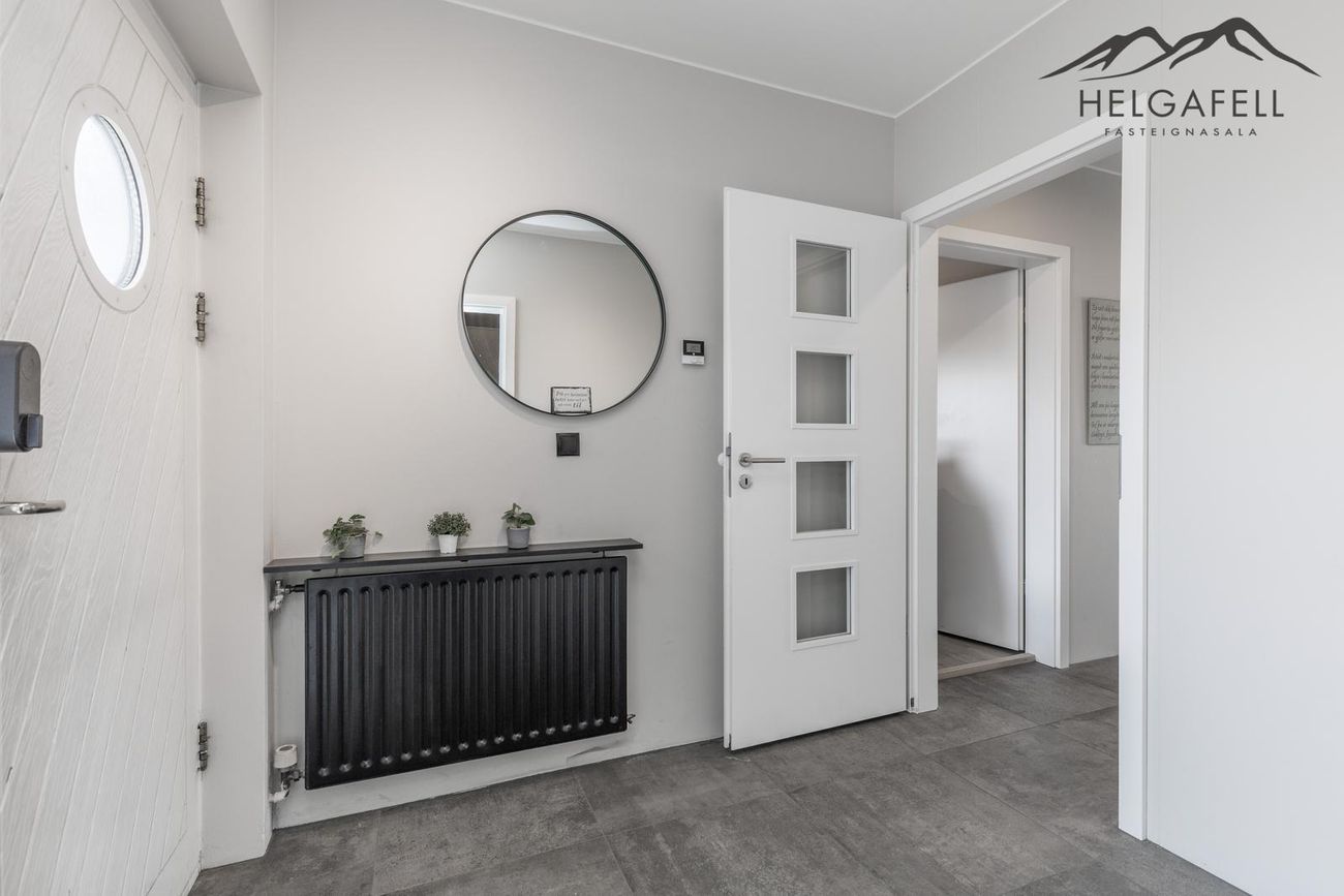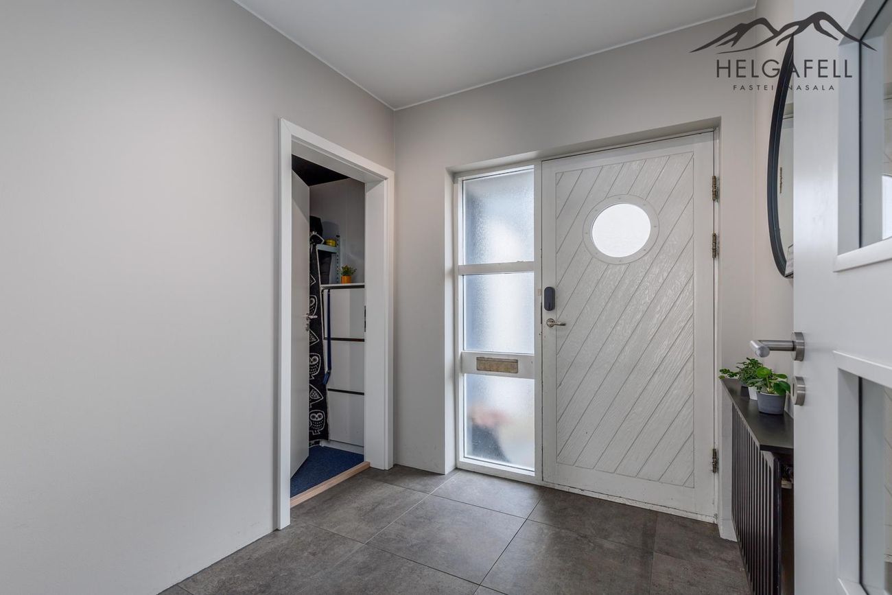 Merkt matseining hjá HMS er 06-0101.Mikil lofthæð er í stofu og í eldhúsrými. Í húsinu eru fjögur svefnherbergi, tvö á hvorri hæð, tvö baðherbergi, eldhús, þvottahús og geymsla, ásamt sambyggðum bílskúr/geymslu. Gott bílastæði er fyrir framan húsið. Fyrir aftan húsið er timburverönd til suðurs með skjólveggjum, heitum potti, útisturtu og rafmagns markissu.