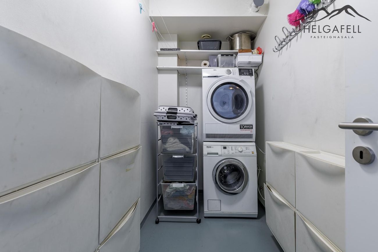Flísalagt rými á neðri hæð eru með gólfhita fyrir utan þvottahús og baðherbergi.