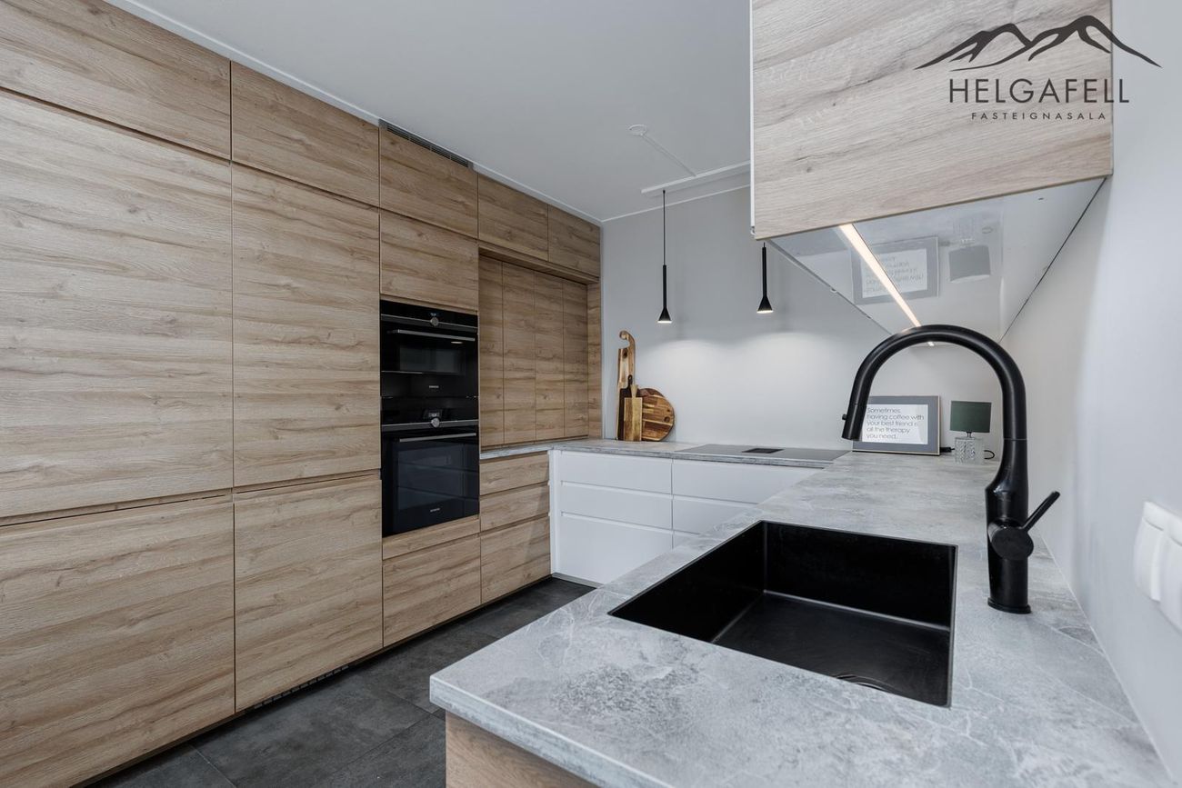 Eldhúsið er opið við stofu með flísalögðu gólfi. Nýleg falleg innrétting með miklu skápaplássi sem nær upp í loft. Tveir ofnar í vinnuhæð, bökunar,- og örbylgjuofn, 90 cm. span helluborð með innbyggðum gufugleypi og stór vaskur.