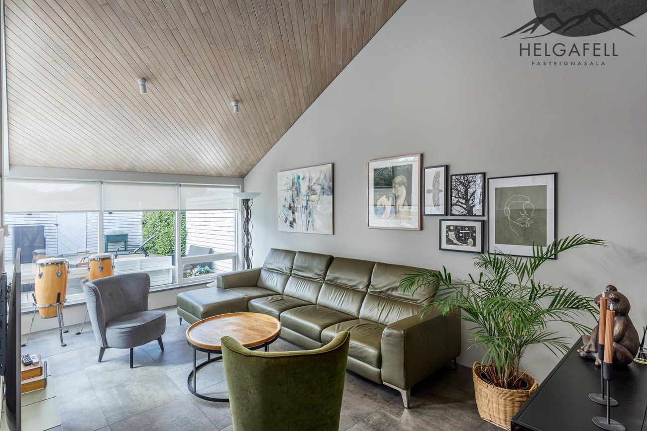 Þrjár tröppur eru niður í flísalagða stofuna. 60x60 flísar frá Birgisson. Mikil lofthæð og stórir gluggar gefa rýminu fallega birtu. Kastarar í lofti og hljóðdempun á veggjum.