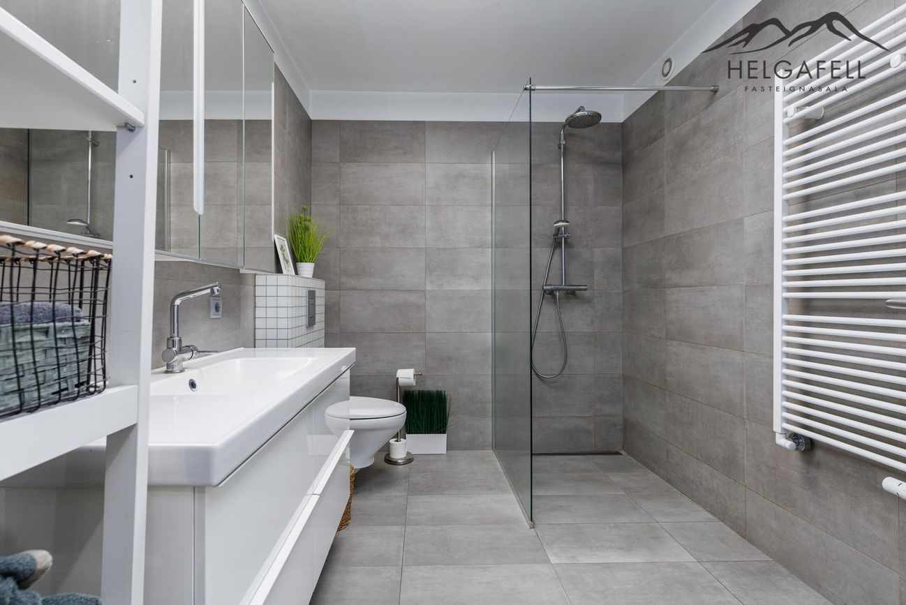 Baðherbergið er með fallegum flísum á gólfi og veggjum, góðri innréttingu, "walk-in" sturtu, stórum vaski og upphengdum handklæðaofni.