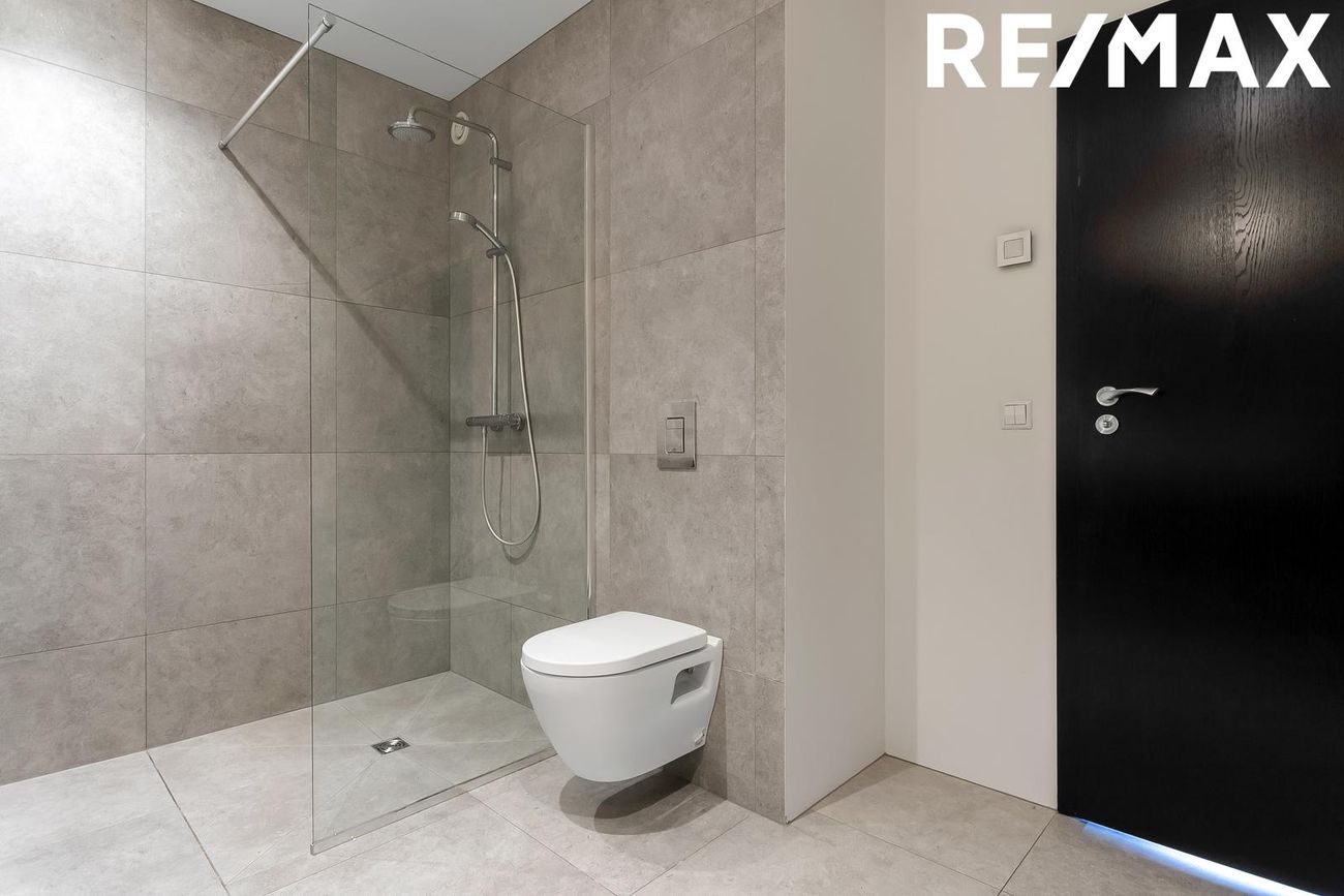 Baðherbergi, með flísum á gólfi og hluta af veggjum, rúmgóð og glæsileg innrétting. Upphengt klósett, handklæðaofn og góð sturta.