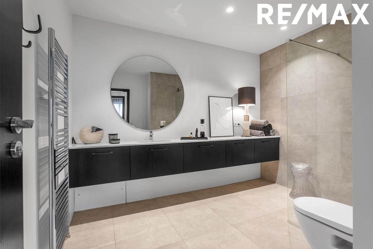 Baðherbergi, með flísum á gólfi og hluta af veggjum, rúmgóð og glæsileg innrétting. Upphengt klósett, handklæðaofn og góð sturta.