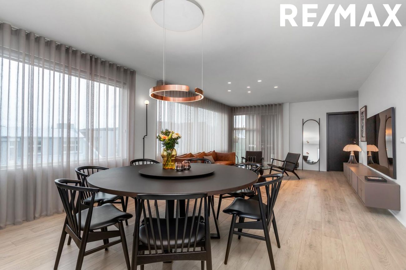 Stofa og borðstofa, mjög rúmgóð og björt með fallegum gluggum og útgengi út á svalir. Falleg lýsing og sérsniðnar gardínur fylgja með. Útgengt er út á góðar svalir út stofu.