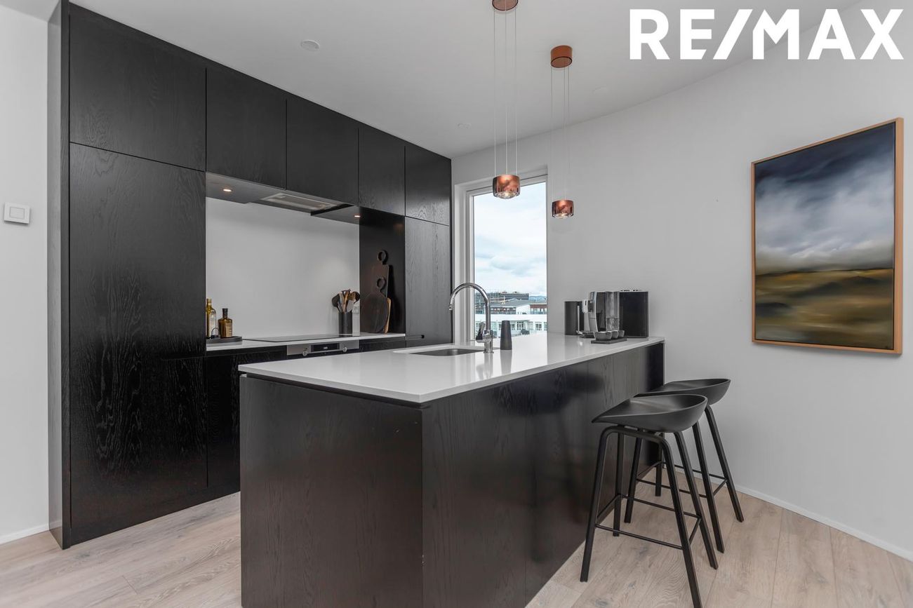 Eldhús, með fallegri innrétting með eyju, uppþvottavél, ísskápur og frystiskápur eru innfelld í innréttingu, ofn í innréttingu er í vinnuhæð. Steinn á borðum. Eyjan er rúmgóð og stæði fyrir allt að fjára stóla.
