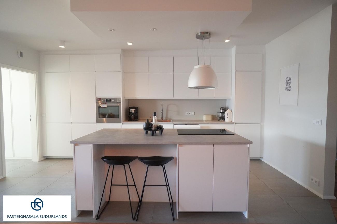 * Eldhúsið er afar fallegt, með hvítri innréttingu og eyju með góðum hirslum og spanhelluborði. Ísskápur og uppþvottavél eru innbyggð. Gráar flísar á gólfi